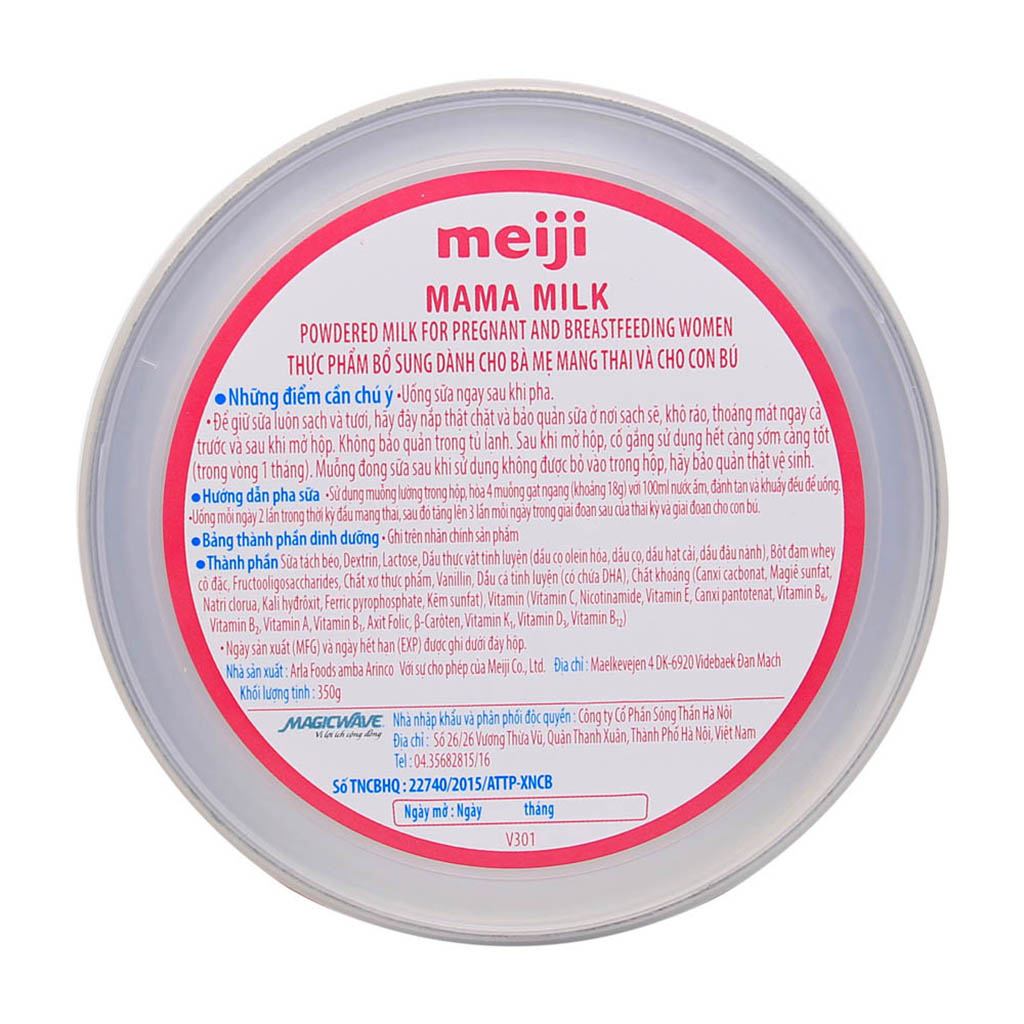 - Được tạo nên với các thành phần chọn lọc theo công nghệ chế biến và đóng hộp tiên tiến, Meiji bà bầu có hương thơm tự nhiên, dịu nhẹ cùng vị ngọt ngậy vừa phải mang đến mẹ những bữa ăn thơm ngon, không gây ngấy, giúp mẹ và bé bổ sung dưỡng chất một cách tự nhiên nhất. Thành phần dinh dưỡng của sữa Sữa tách béo, Dextrin, Lactose, Dầu thực vật tinh luyện (dầu cọ olein hóa, dầu cọ, dầu hạt cải, dầu đậu nành), Bột đạm whey cô đặc, Fructooligosaccharides, Chất xơ thực phẩm, Vanillin, Dầu cá tỉnh luyện (có chứa DHA), Chất khoáng (Canxi cacbonat, Magiê sunfat, Natri clorit, Kali hydrôxit, Ferric pyrophosphate, Kêm sunfat), Vitamin (Vitamin C, Vitamin E, Nicotinamit,Canxi pantotenat, Vitamin B6, Vitamin B2, Vitamin A, Vitamin B1, Axit Folic, B-Carôten, Vitamin K1, Vitamin D3, Vitamin B12).