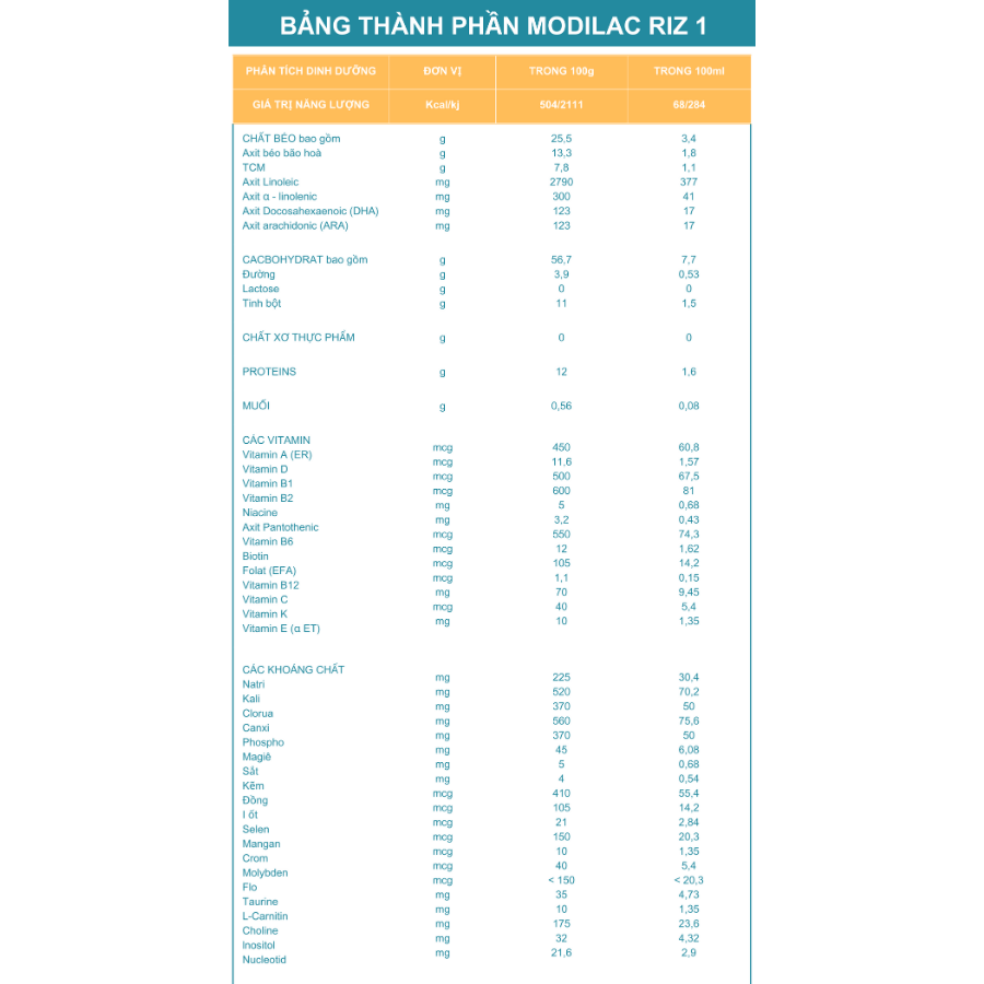 Sữa mẹ là thức ăn tốt nhất cho sức khỏe và sự phát triển toàn diện của trẻ sơ sinh và trẻ nhỏ.   Sữa bột cao cấp Modilac Expert Riz 1 dành cho trẻ từ 0-6 tháng tuổi được nhập khẩu nguyên hộp từ Pháp   MODILAC EXPERT RIZ DÀNH RIÊNG CHO TRẺ BẤT DUNG NẠP LACTOSE   • Modilac Expert Riz là sản phẩm nội địa Pháp phù hợp khi bị dị ứng đạm sữa bò với đạm gạo thủy phân, không chứa lactose, tăng cường canxi theo khuyến nghị và cung cấp nguồn dinh dưỡng toàn diện. • Modilac Expert Riz hoàn toàn không chứa lactose phù hợp với trẻ bất dung nạp lactose. Là sản phẩm thuộc tập đoàn Savencia (Pháp) với nguồn đạm gạo thủy phân, bổ sung canxi cao (theo khuyến nghị chuyên khoa) và công thức nghiên cứu đặc biệt phù hợp cho trẻ dị ứng đạm bò, bất dung nạp lactose, Modilac Expert Riz là sản phẩm được các ba mẹ tại nhiều nước trên thế giới tin chọn.   6 YÊN TÂM KHI MẸ CHỌN MODILAC SỮA NỘI ĐỊA PHÁP  • Modilac là dòng sữa nội địa cao cấp tại Pháp. • Đầy đủ chứng nhận ISO 9001 & ISO 22000. • Là một trong ít nhãn sữa có viện nghiên cứu riêng. • Mỗi lon sữa Modilac đều được cải tiến không ngừng, phù hợp với sự phát triển của bé. • Trải qua hơn 800 lần xét nghiệm, hơn 200 lượt kiểm tra trước khi đưa ra thị trường. • Là dòng sữa công thức sản xuất bởi tập đoàn Savencia với hơn 60 xây dựng và phát triển. • Modilac Expert Riz là sản phẩm của Tập đoàn Savencia, top 1 về sản xuất bơ sữa tại Pháp, top 5 về sản xuất bơ sữa toàn cầu. Các sản phẩm của Savencia có mặt tại 120 quốc gia.    HƯỚNG DẪN SỬ DỤNG Lưu ý: Xuất xứ: Pháp Hạn sử dụng: 24 tháng Bảo quản sữa bột Modilac ở nơi thoáng mát, khô ráo trước và sau khi mở. Sau khi mở, đóng nắp thật chặt. Sử dụng trong vòng 1 tháng kể từ lần mở hộp đầu tiên.