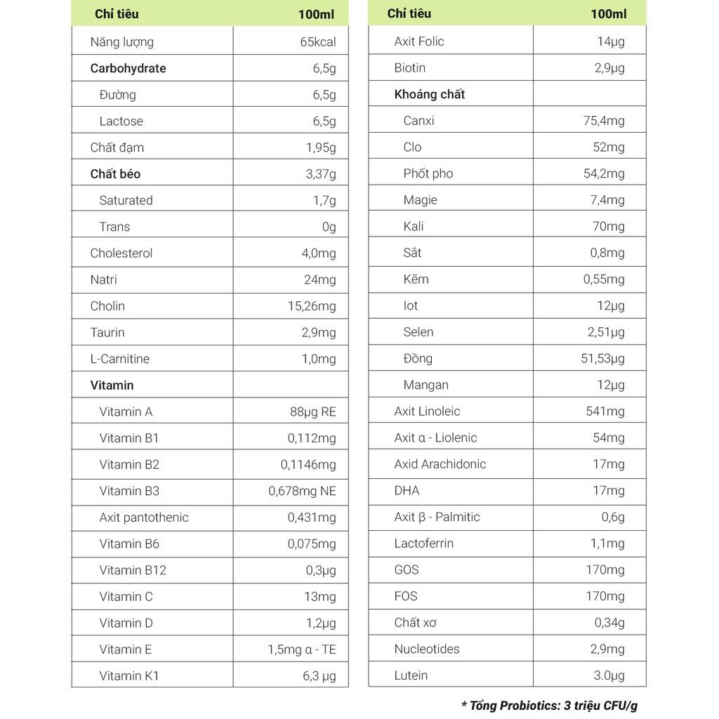 Thành phần: Trong mỗi 100g thành phẩm có chứa các thành phần sau: 158g sữa gầy *, Bột Whey đã khử khoáng một phần * (từ sữa), Dầu thực vật * (Dầu cọ *, Dầu