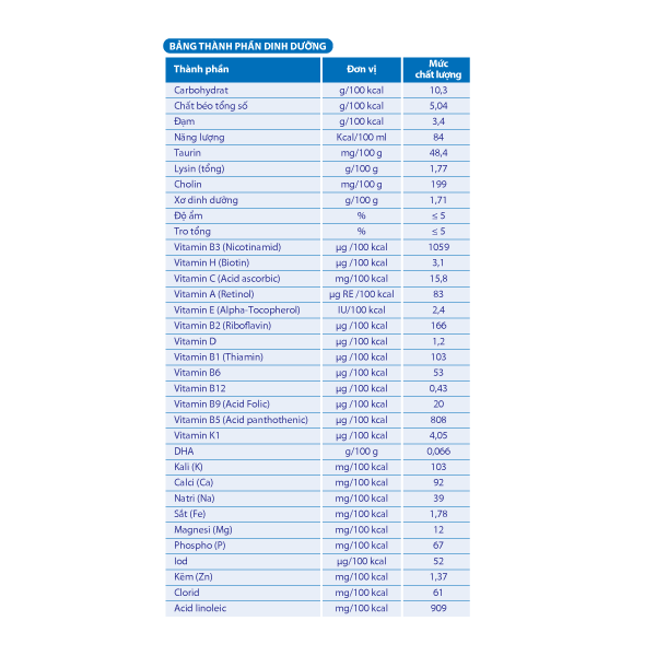 THÀNH PHẦN: Sữa bột nguyên kem bổ sung Vitamin A và D3, bột sữa (bột sữa tách béo, hỗn hợp dầu thực vật (dầu cọ, dầu bắp, dầu hạt cải, dầu hướng dương), glucose syrup,
