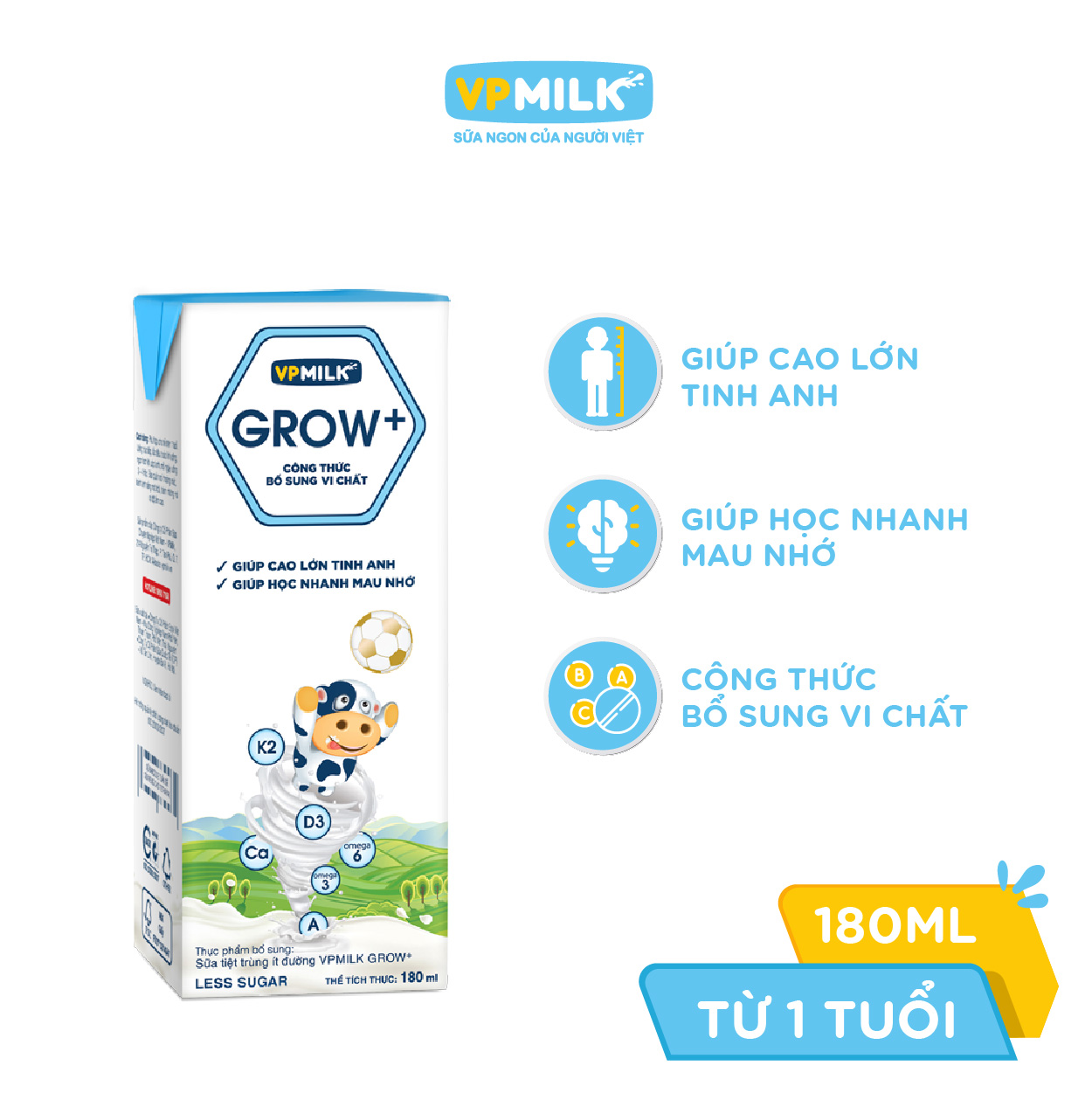 Sữa Tiệt Trùng VPMilk Grow+ là loại sữa phù hợp cho trẻ từ 1 tuổi trở lên. Sản phẩm được nghiên cứu theo thể trạng của trẻ em Việt Nam sẽ đồng hành cùng mẹ nhằm đem đến nền tảng khoẻ mạnh tự nhiên cho bé yêu. Với Sữa Tiệt Trùng VPMilk Grow+ giờ đây mẹ đã có thể yên tâm và tự tin rằng đã có một giải pháp hoàn hảo để con yêu có thể phát triển cao lớn vượt trội, giúp con thêm tự tin, vững bước thành công trong tương lai.