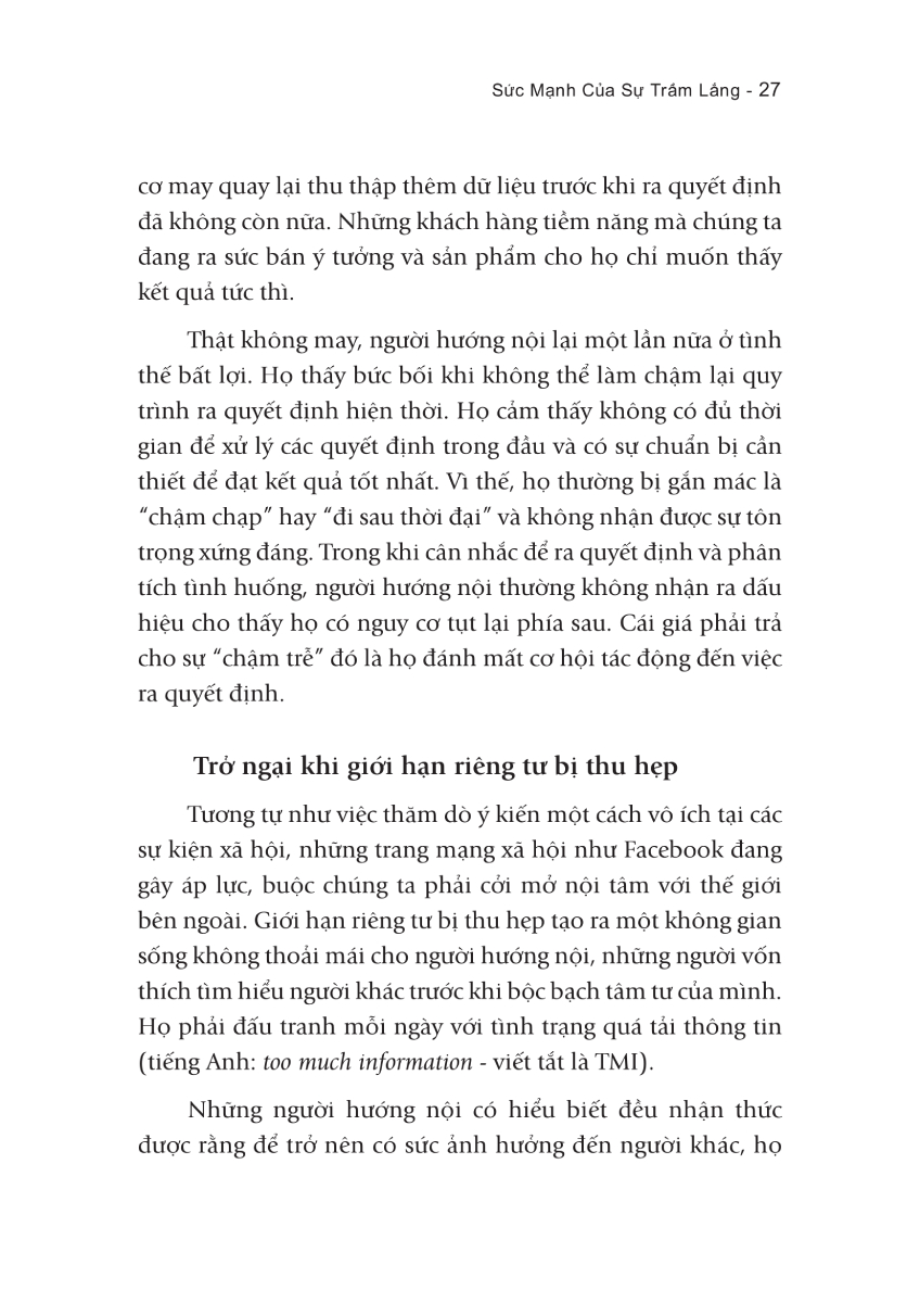 Sức Mạnh Của Sự Trầm Lắng - The Introvert's Guide To Making A Difference “Những người hướng nội, trong đó có bạn, chiếm khoảng năm mươi phần trăm dân số thế giới, và bạn hoàn toàn có thể tạo ra sự khác biệt lớn lao cho thế giới này.” Khác với những tựa sách cùng chủ đề, “Sức mạnh của sự trầm lắng” không định hướng người hướng nội thay đổi để thích nghi với thế giới dường như chủ yếu dành cho người hướng ngoại. Thay vào đó, cuốn sách sẽ giúp bạn - một người hướng nội - sống và tỏa sáng theo cách riêng của mình. Không ít người hướng nội đang gồng mình để trở thành những người trông-có-vẻ năng động, hoạt náo, và giỏi quảng giao, sống theo kiểu của người hướng ngoại. Khi chỉ còn một mình, rất nhiều người trong số ấy cảm thấy như kiệt sức sau những “vai diễn” của mình ở chốn công sở, ngoài xã hội, trước mặt bạn bè, thậm chí là người thân. Cũng bởi chúng ta đang sống trong thời đại mà “mọi người vẫn tin rằng phải khoa trương ầm ĩ mới có thể làm nên điều khác biệt”, rất nhiều người hướng nội như bạn đang cố nhào nặn chính mình để sống theo “lý tưởng hướng ngoại”. Bạn đã không biết rằng với thế mạnh trầm tĩnh bẩm sinh của mình, bạn hoàn toàn có thể vừa phát triển sự nghiệp theo định hướng của bản thân, vừa tạo nên những tác động tích cực đến những người xung quanh, và quan trọng nhất là sống thật với cảm xúc, tự do là chính mình giữa thế giới dường như ưa chuộng sự hướng ngoại. Trong “Sức mạnh của sự trầm lắng” (tựa gốc “Quiet Influence: The Introvert's Guide to Making a Difference”), tác giả của cuốn sách, tiến sĩ Jennifer Kahnweiler, giúp người hướng nội nhận diện sáu thế mạnh của mình, bao gồm: Dành thời gian để tĩnh lắng, Chuẩn bị, Lắng nghe thấu đáo, Trao đổi có trọng tâm, Viết lách, và Sử dụng mạng xã hội một cách cẩn trọng. Với mỗi thế mạnh, tiến sĩ Kahnweiler đều phân tích cụ thể, giúp người đọc có cái nhìn mạch lạc và thiết thực vào từng thế mạnh, nhờ đó mà độc giả có thể dễ dàng nắm bắt và biết cách áp dụng mỗi thế mạnh vào thực tế cuộc sống của mình để trở thành Người Ảnh hưởng Hướng nội - tức những người hướng nội có tầm ảnh hưởng tới mọi người xung quanh. Một điểm thú vị của cuốn sách là ở mỗi thế mạnh, sau khi chia sẻ vai trò cách làm thế nào để thế mạnh giúp bạn tạo ảnh hưởng, và các bước cần làm để phát huy thế mạnh đó, tác giả đều khuyến cáo về việc lạm dụng thế mạnh. Chẳng hạn như lạm dụng thế mạnh Lắng nghe thấu đáo có thể khiến bạn tự đánh mất uy thế của bản thân, hay Dành thời gian để tĩnh lắng quá nhiều là yếu tố khiến động lực bị giảm sút…. Thông qua đó, cuốn sách giúp người hướng nội hiểu thấu đáo hơn về mỗi thế mạnh, liên hệ với thực tế của mình và từ đó tìm ra cách phối hợp cân đối các thế mạnh đó. Không dừng lại ở việc chia sẻ kiến thức, tác giả còn đưa ra nhiều câu chuyện thực tế về những Người Ảnh hưởng Hướng nội. Điều này không chỉ làm cho nội dung sách trở nên thú vị và thuyết phục hơn, mà cuốn sách còn truyền động lực cho các độc giả hướng nội khi họ được chia sẻ những câu chuyện và kinh nghiệm của  những người hướng nội có sức ảnh hưởng trong mọi lĩnh vực. Độc giả còn có thể tự kiểm tra mức độ mà mình đang vận dụng sáu thế mạnh để có sự điều chỉnh cho phù hợp thông qua một công cụ được tác giả gọi là “Bài kiểm tra Chỉ số ảnh hưởng thầm lặng”. Bài kiểm tra này còn có thể được sử dụng sau khi bạn đọc áp dụng những phương pháp được đề cập trong cuốn sách để đánh giá sự thay đổi. Những ý tưởng mà tác giả gửi gắm trong cuốn sách có tính thực tiễn cao, đi thẳng vào trọng tâm và dễ nắm bắt. Thông điệp mà tiến sĩ Kahnweiler đưa ra cũng rất rõ ràng, rằng “Người hướng nội có thể là những người rất giỏi tạo ảnh hưởng nếu họ biết tận dụng tối đa những thế mạnh bẩm sinh của mình thay vì cố bắt chước cách hành xử của người hướng ngoại”. Là một cuốn sách viết về người hướng nội nhưng “Sức mạnh của sự trầm lắng” lại dành cho cả người hướng ngoại để thấu hiểu rằng, khi những người hướng nội im lặng không phải vì họ vô tâm, mà là vì họ đang hành xử kín đáo, quan tâm theo cách riêng của mình; khi họ “trốn” một mình ở một góc nào đó không phải vì họ không muốn hòa hợp với mọi người, mà đơn giản vì họ cần một khoảng không gian riêng tư để nạp lại năng lượng… Họ - những người hướng nội đang ở quanh bạn - cũng có những áp lực, vui buồn, những cung bậc cảm xúc giống như bạn, chỉ là họ có cách bộc lộ riêng và đang đợi bạn khám phá thông qua cuốn sách này. Người nổi tiếng nói gì về cuốn sách “Một cuốn sách đặc bi