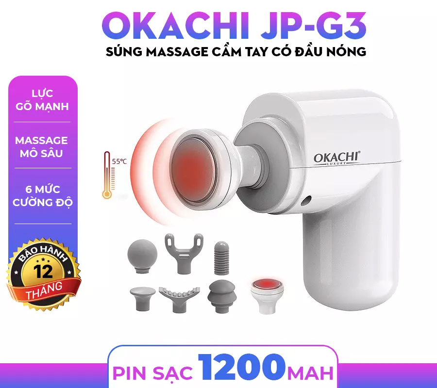 Súng massage cầm tay OKACHI JP-G3, với đầu nóng màu đen, không chỉ tác động vào các lớp cơ dưới da mà còn đánh tan những nút thắt cơ, đào thải axit lactic. Điều này giúp cơ thể thư giãn, giảm đau mỏi nhanh chóng, gấp 3 lần so với giải pháp thông thường.