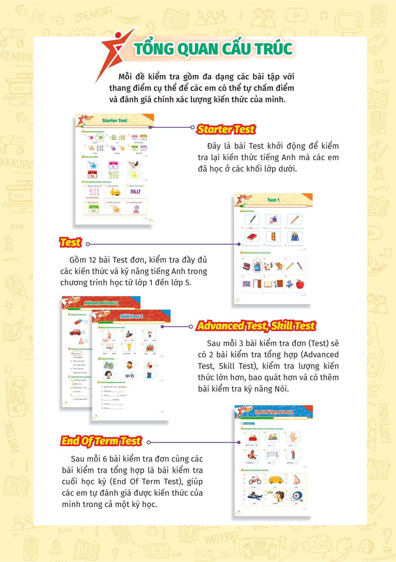 Bộ sách cung cấp các bài kiểm tra từ cơ bản đến nâng cao, bao gồm nhiều loại bài kiểm tra khác nhau, bao gồm kiểm tra từ vựng, kỹ năng nghe, đọc, viết và nói. Điều này giúp học sinh phát triển toàn diện các kỹ năng Tiếng Anh của họ và kiểm tra tất cả các khía cạnh của môn học.