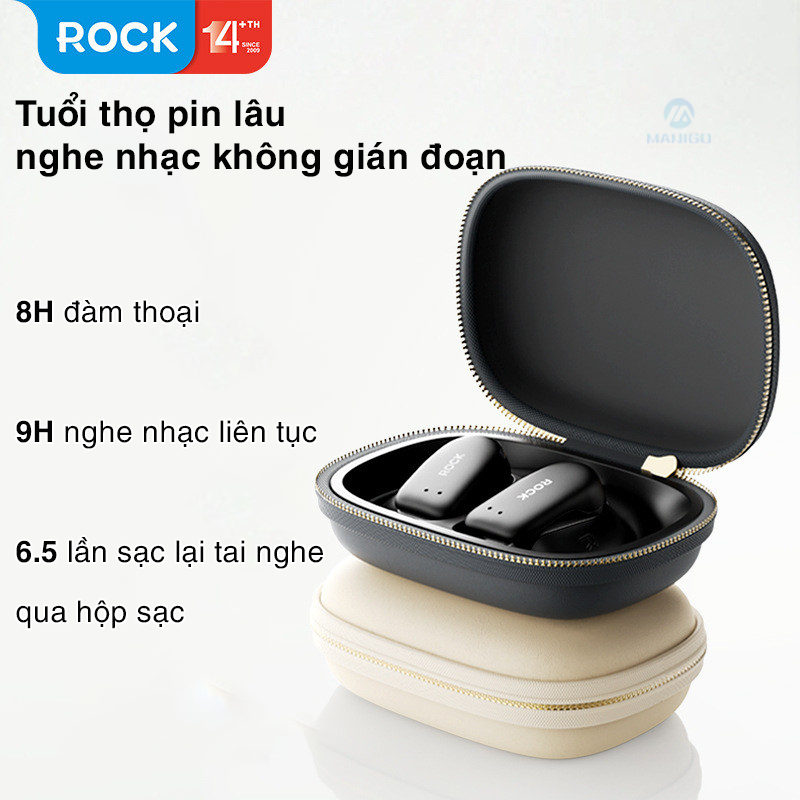 - Tai nghe bluetooth không dây kẹp vành tai Rockspace X900 OWS có thời gian nghe nhạc liên tục 9h khi sạc đầy, thời gian đàm thoại liên tục 8h