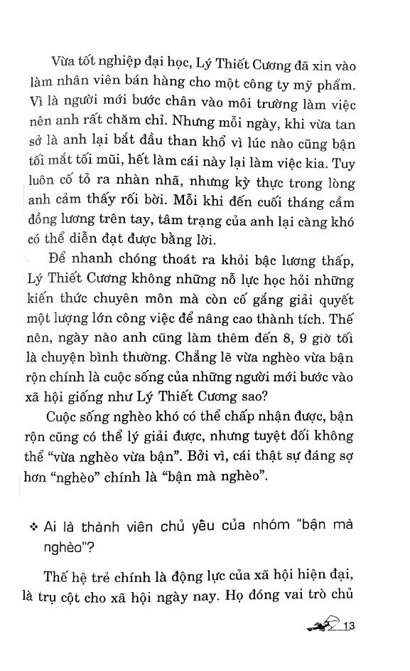 Bạn sẽ tìm thấy những kiến giải về vấn đề này trong “Tại sao càng bận càng nghèo càng nhàn càng giàu”. Cuốn sách Tại sao càng bận càng nghèo càng nhàn càng giàu đi sâu phân tích những nguyên nhân chính khiến bạn có thể bị liệt vào nhóm “những người bận mà nghèo”, từ đó giúp bạn thay đổi cách tư duy và hành động đã từng khiến bạn vất vả mà vẫn không thu được kết quả gì trong công việc và cuộc sống. Sách còn nêu ra những ví dụ cụ thể để minh họa, củng cố thêm cho những lập luận.