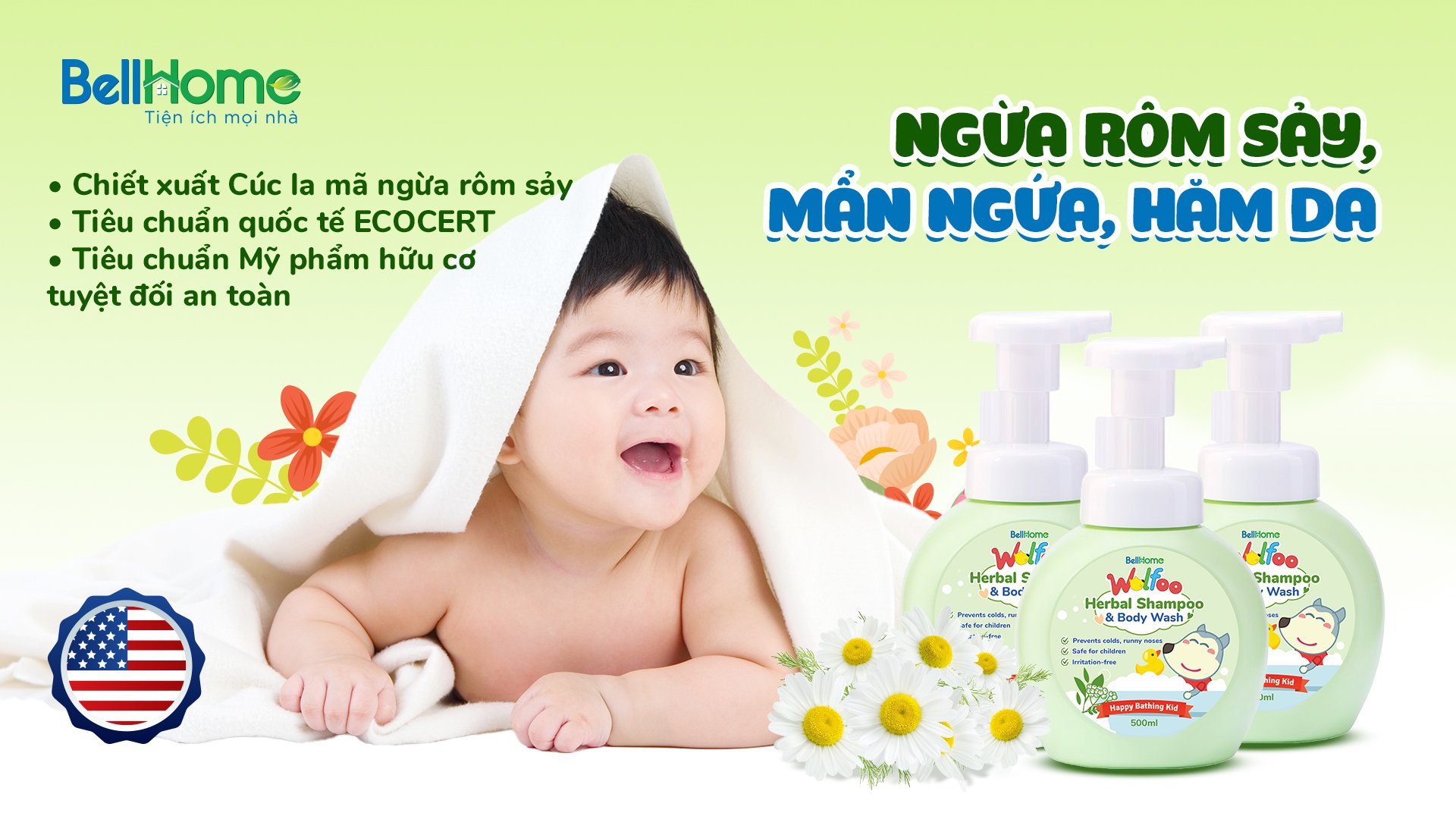 - Dùng đủ kháng sinh, hạ sốt mà vẫn không đỡ, chưa kể tác dụng phụ. Thấu hiểu nỗi lòng của mẹ,Bell Home cho ra đời dòng sản phẩm Tắm Gội Thảo Dược Wolfoo Baby chống cảm chuyên biệt đồng hành cùng mẹ bảo vệ bé yêu Thành phần chính: