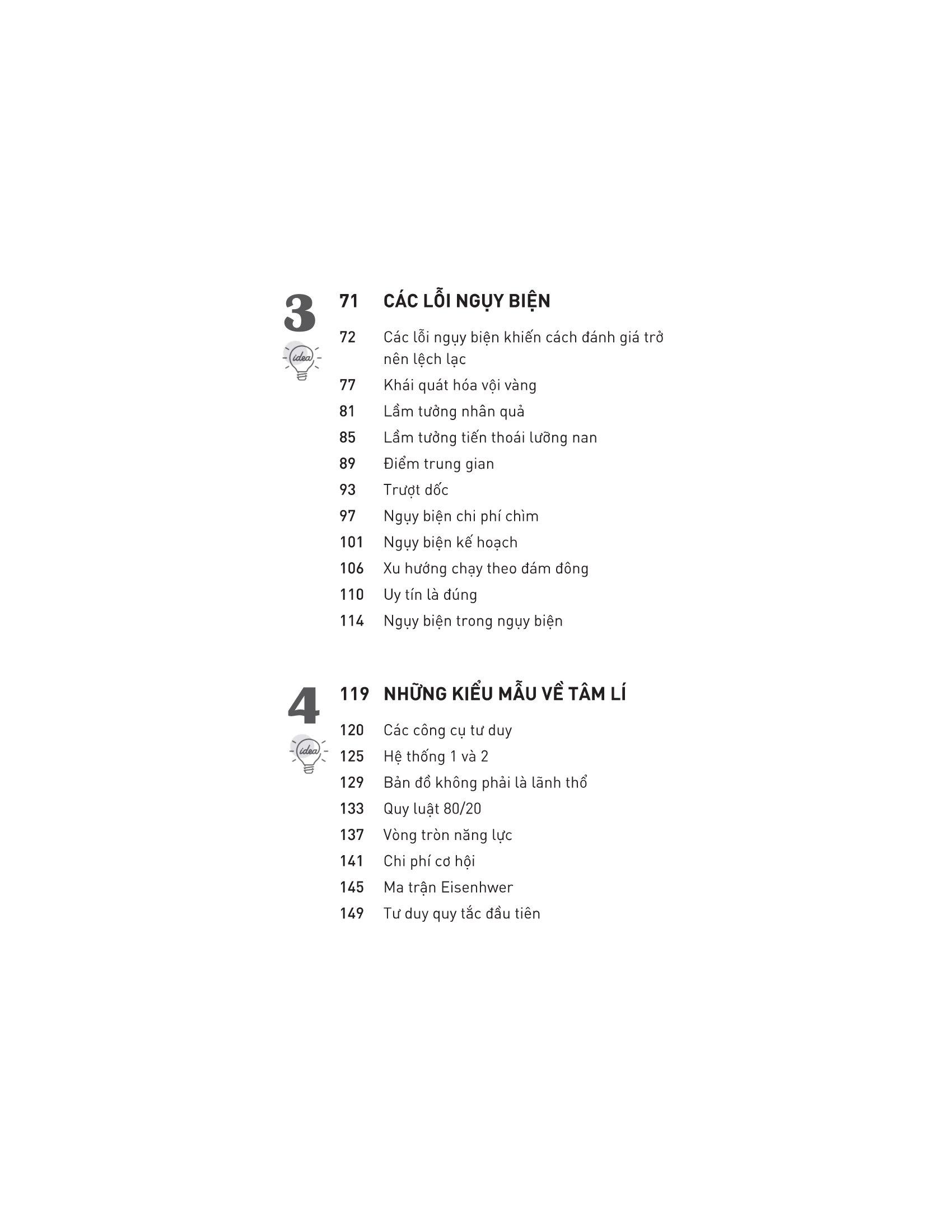 Cụ thể, trong cuốn sách này chúng ta sẽ đào sâu tìm hiểu tất cả các yếu tố tâm lý học ảnh hưởng đến khả năng ra quyết định và lựa chọn của chúng ta, bao gồm: