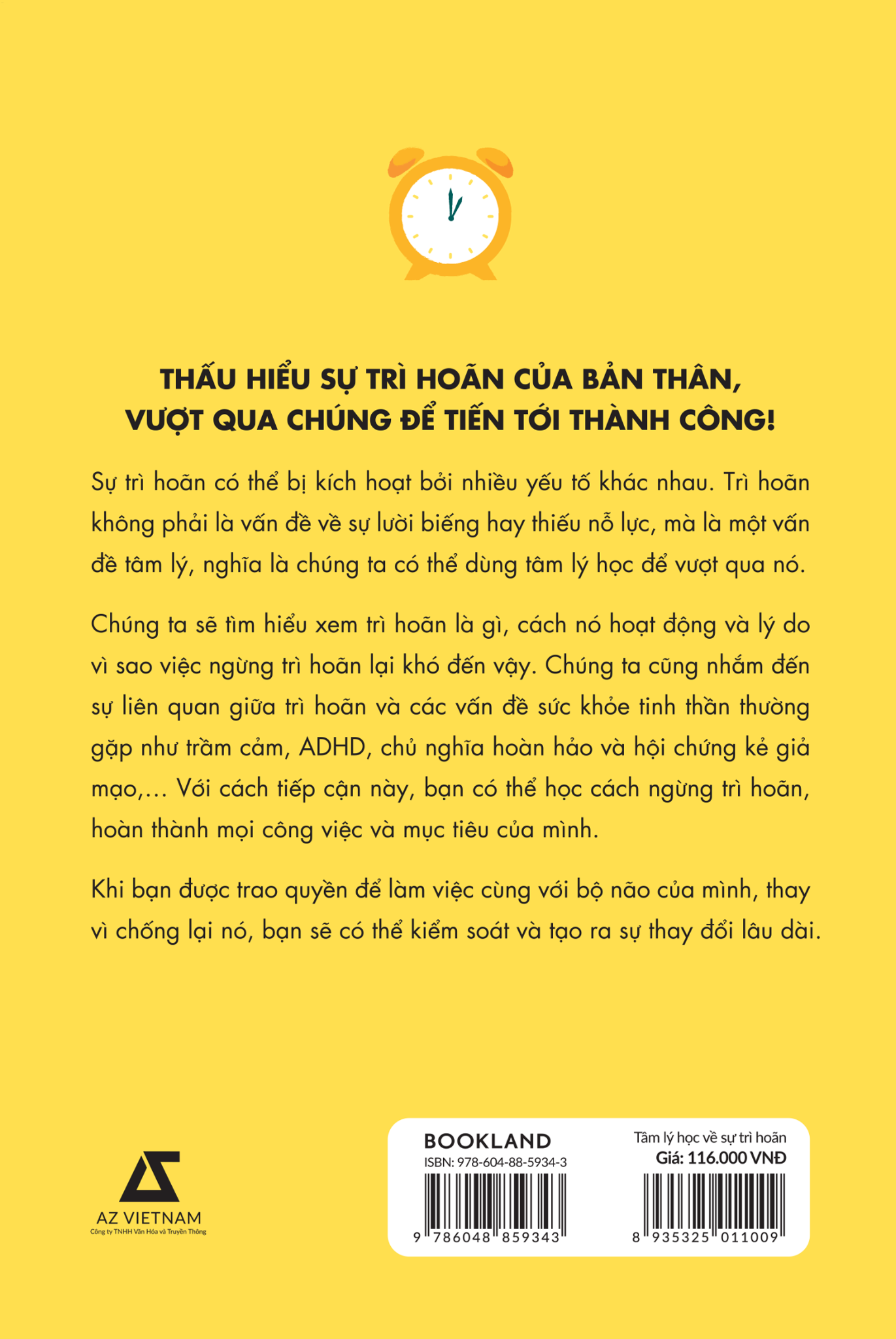 Mã hàng 8935325011009 Tên Nhà Cung Cấp AZ Việt Nam Tác giả Hayden Finch PhD Người Dịch Tín Nghĩa NXB Dân Trí Năm XB 2023 Ngôn Ngữ Tiếng Việt Trọng lượng (gr) 180 Kích Thước Bao Bì 19 x 13 cm Số trang 204 Hình thức Bìa Mềm Đã từ lâu, bạn vẫn luôn chật vật với sự trì hoãn, gặp rắc rối với việc bắt kịp deadline, hoàn thành các dự án và đạt được những mục tiêu của mình. Bạn đã thử vô vàn các chiến lược và kỹ thuật khác nhau để vượt qua sự trì hoãn, nhưng không cái nào có vẻ thành công cả. Đôi khi, bạn phân vân rằng những điều người ta nói biết đâu lại đúng - có thể vấn đề ở đây là bạn quá lười hoặc không đủ kỷ luật. Và sự thật là nó phức tạp hơn thế rất nhiều!