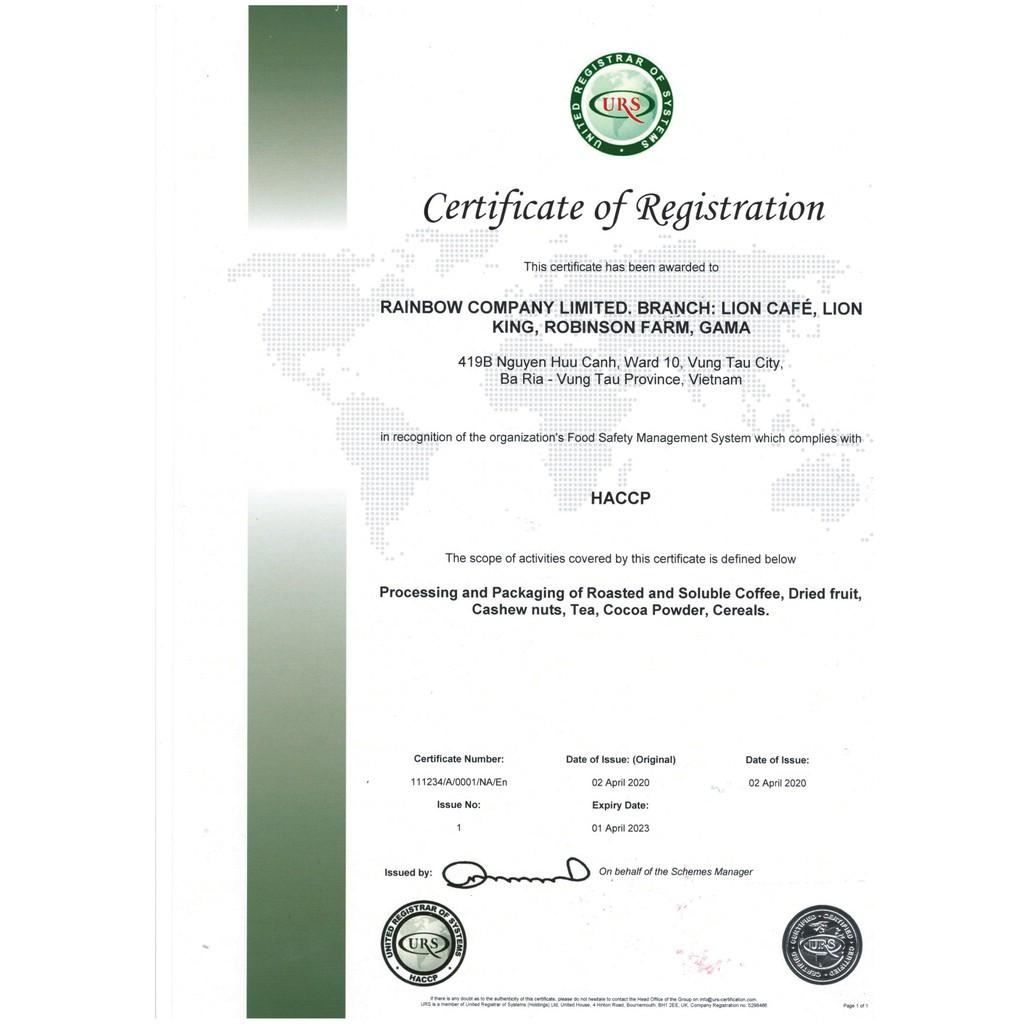 Đạt Chứng nhận quốc tế ISO 22000:2018 An Toàn Thực Phẩm cấp bởi Tổ Chức URS Anh Quốc.