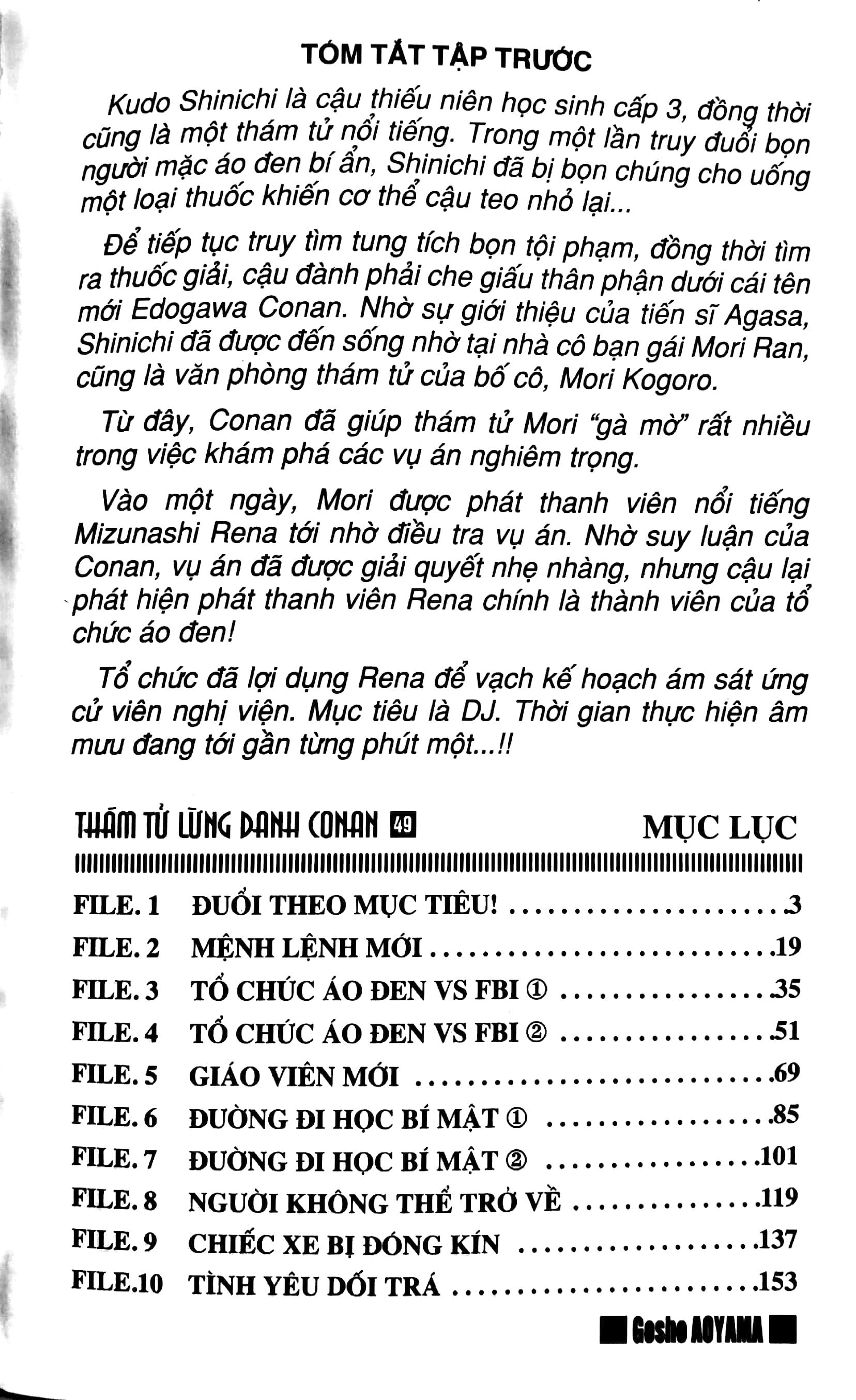 Mua tại TiktokThám Tử Lừng Danh Conan - Tập 49 Conan và các bạn quen được với nữ phát thanh viên Mizunashi Rena. Nhưng không ngờ, nhóm lại phát hiện ra Rena chính là một thành viên của tổ chức áo đen. Hơn thế, bọn áo đen còn sử dụng Rena để thực hiện kế hoạch ám sát ứng cử viên sẽ ra tranh cử nghị sĩ quốc hội. Thời khắc tiến hành kế hoạch đã đến rất gần! Tổ chức áo đen đang đối đầu rất quyết liệt với FBI! Gosho Aoyama Xin chào, tôi là Aoyama đây!! Chắc tại tôi già rồi (cười) nên dạo này rất khổ sở vì bệnh đau lưng, đến mức đành phải mua cái ghế massage. Xử lí nốt công việc, đi tắm, thay đồ ngủ, chuẩn bị xong tất cả mọi việc rồi… bật công tắc! Ngay lập tức tôi sẽ nghe thấy câu “xin mời đến với không gian thư giãn”…