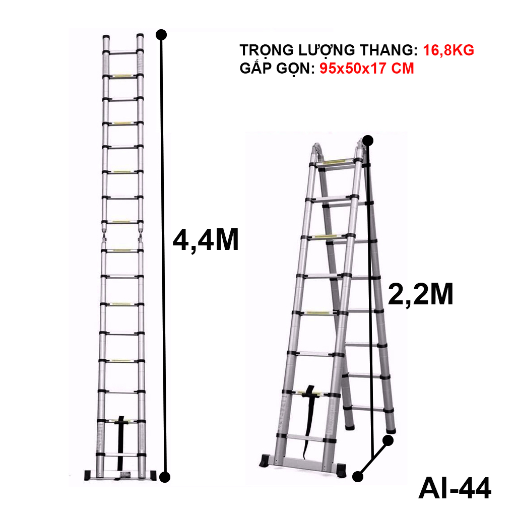 Thang nhôm rút đơn cao cấp Ashi - Chiều cao tối đa: 4,4 m - Chiều cao rút gọn: 0,95m - Bậc: 13 bậc - Tải trọng tối đa: 150kg - Độ dầy ống: 1,3mm-1,5mm
