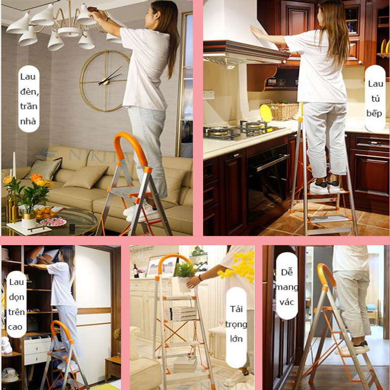 CHI TIẾT SẢN PHẨM   Thang tay vịn INOX được sản xuất theo mẫu Châu Âu  tiêu chuẩn EN 131, phần tay vịn được bọc nhựa tránh trơn trượt, đảm bảo an toàn khi sử dụng                                                         • CHÂN THANG: làm bằng cao su chịu lực có các rãnh nhỏ chống trơn trượt                             Bậc thang rộng và khoảng cách giữa các bậc rất ngắn giúp người leo lên xuống an toàn và thoải mái.                                      Thang tay vịn Inox Nikita có độ bền chắc chắn, tải trọng cao, đặc biệt rất thích hợp cho phụ nữ và người cao tuổi.                                 Thang được thiết kế với mẫu mã đẹp, rất tiện lợi cho gia đình, dễ dàng cất gọn sau cánh cửa, sau tủ hay gầm giường…                      Thang Inox tay vịn thích hợp sử dụng cho phụ nữ, dùng làm vườn, lấy hồ sơ, thay bóng đèn, lau cửa kính…