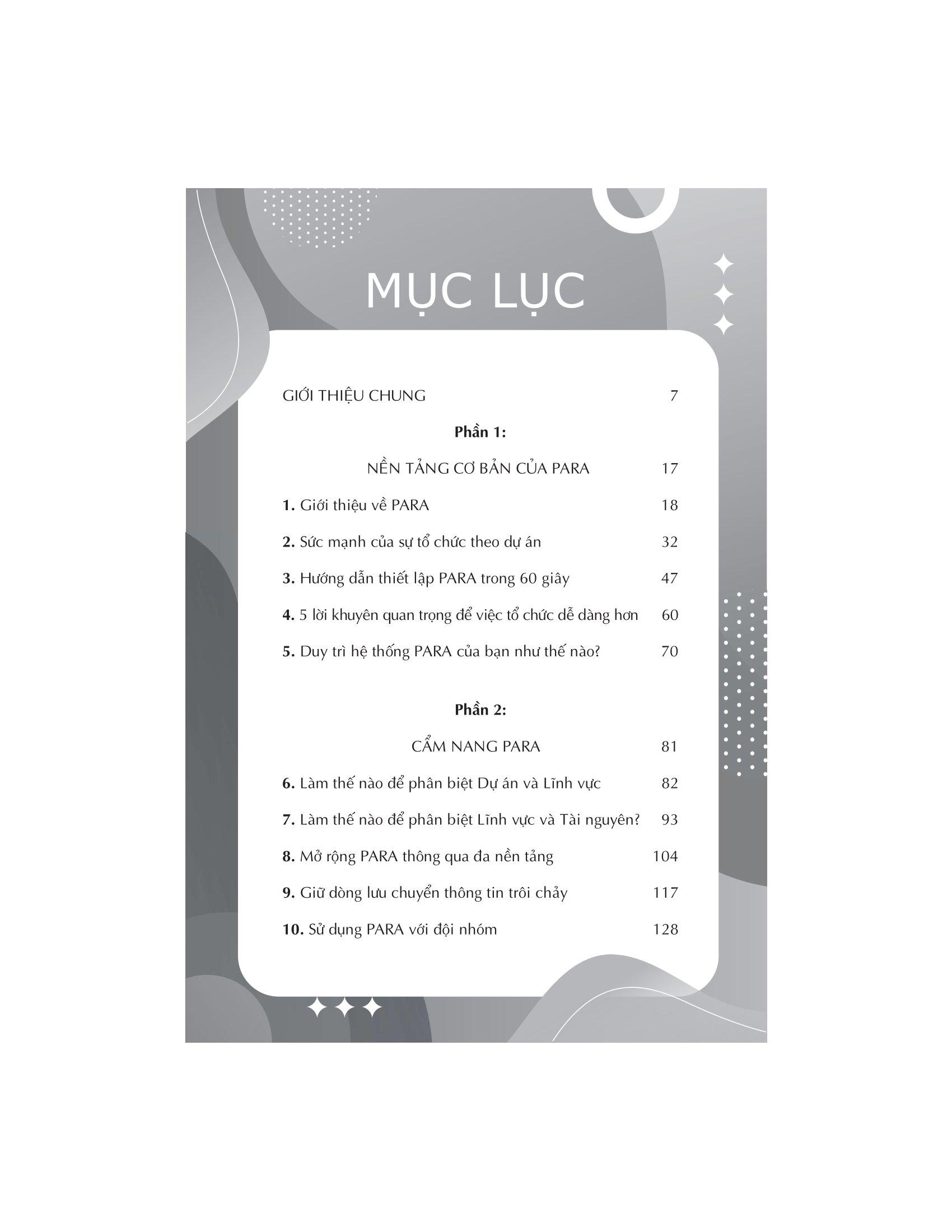 Cuộc sống hiện đại đòi hỏi phải xử lý rất nhiều thông tin. Nhưng chúng ta chưa bao giờ được dạy cách quản lý thông tin một cách hiệu quả để có thể tìm thấy thứ m.ình cần. Trong The PARA METHOD – Phương pháp tổ chức thông tin trong công việc, Tiago Forte phác thảo một hệ thống bốn bước đơn giản và trực quan sẽ giúp chúng ta sắp xếp tất cả thông tin tràn ngập trong não thành bốn loại chính. Theo đó PARA là từ viết tắt của “Projects” (Dự án), “Areas” (Lĩnh vực), “Resources” (Tài nguyên) và “Archives” (Lưu trữ).