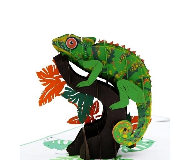Khác biệt và độc đáo, thiệp 3D tắc kè hoa nghệ thuật mang lại sự bất ngờ thú vị cho người nhận. Khi mở thiệp, hình ảnh chú tắc kè nhiều màu sắc nổi bật