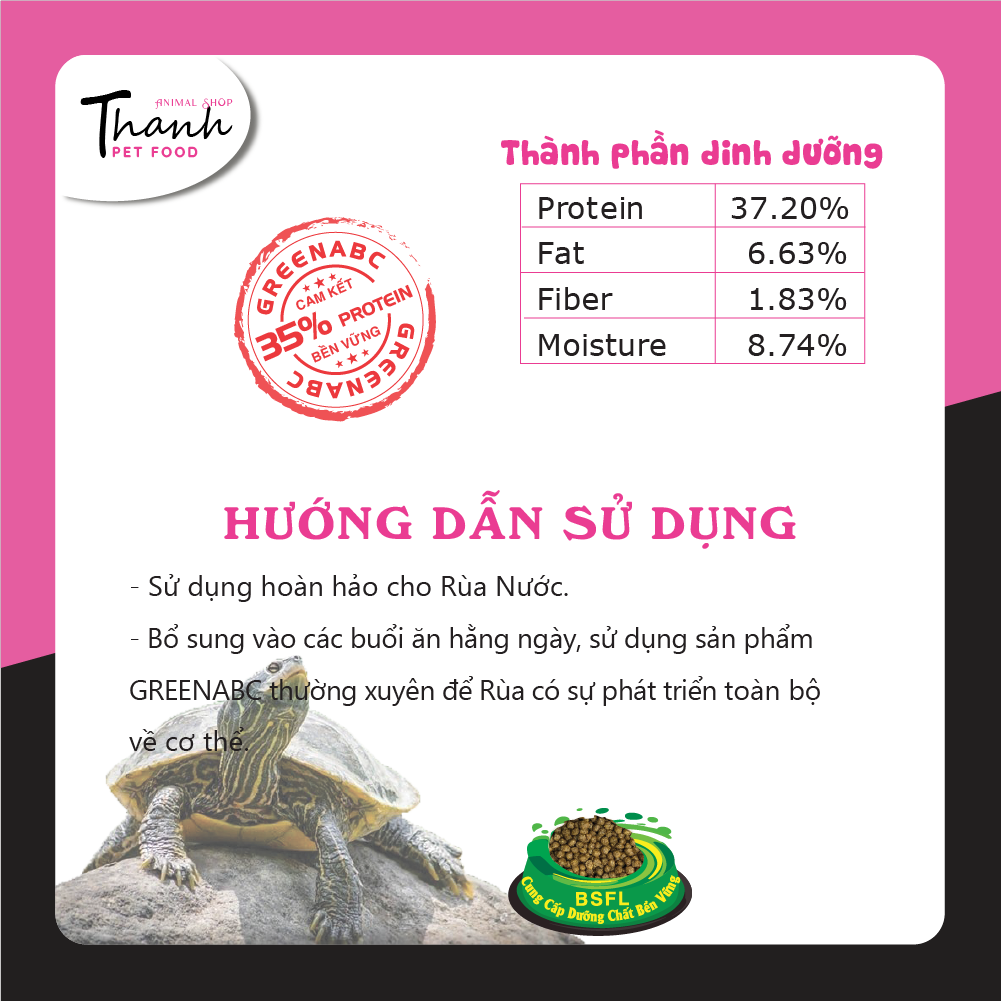 GREENABC là thức ăn bổ dưỡng dành cho RÙA NƯỚC - TURTLE. Đặc biệt sản phẩm GREENABC được sản xuất theo phương pháp Áp dụng công nghệ PROTEIN Bền Vững từ bột đạm G.Meal rất giàu PROTEIN – CANXI – LIPID có trong BSFL, đã được Mỹ (AAFCO) và EU chấp nhận đưa vào công thức cho ngành sản xuất thức ăn vật nuôi.