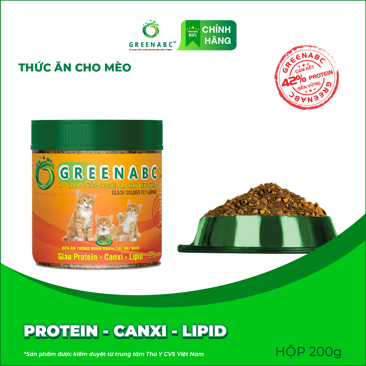 GREENABC là thức ăn cao cấp dành cho các mèo. Đặc biệt sản phẩm GREENABC được sản xuất theo phương pháp Áp dụng công nghệ PROTEIN BỀN VỮNG từ bột đạm G.Meal rất giàu PROTEIN–CANXI–LIPID có trong BSFL*, đã được Mỹ (AAFCO) và EU chấp nhận đưa vào công thức cho ngành sản xuất thức ăn dành cho thú cưng.