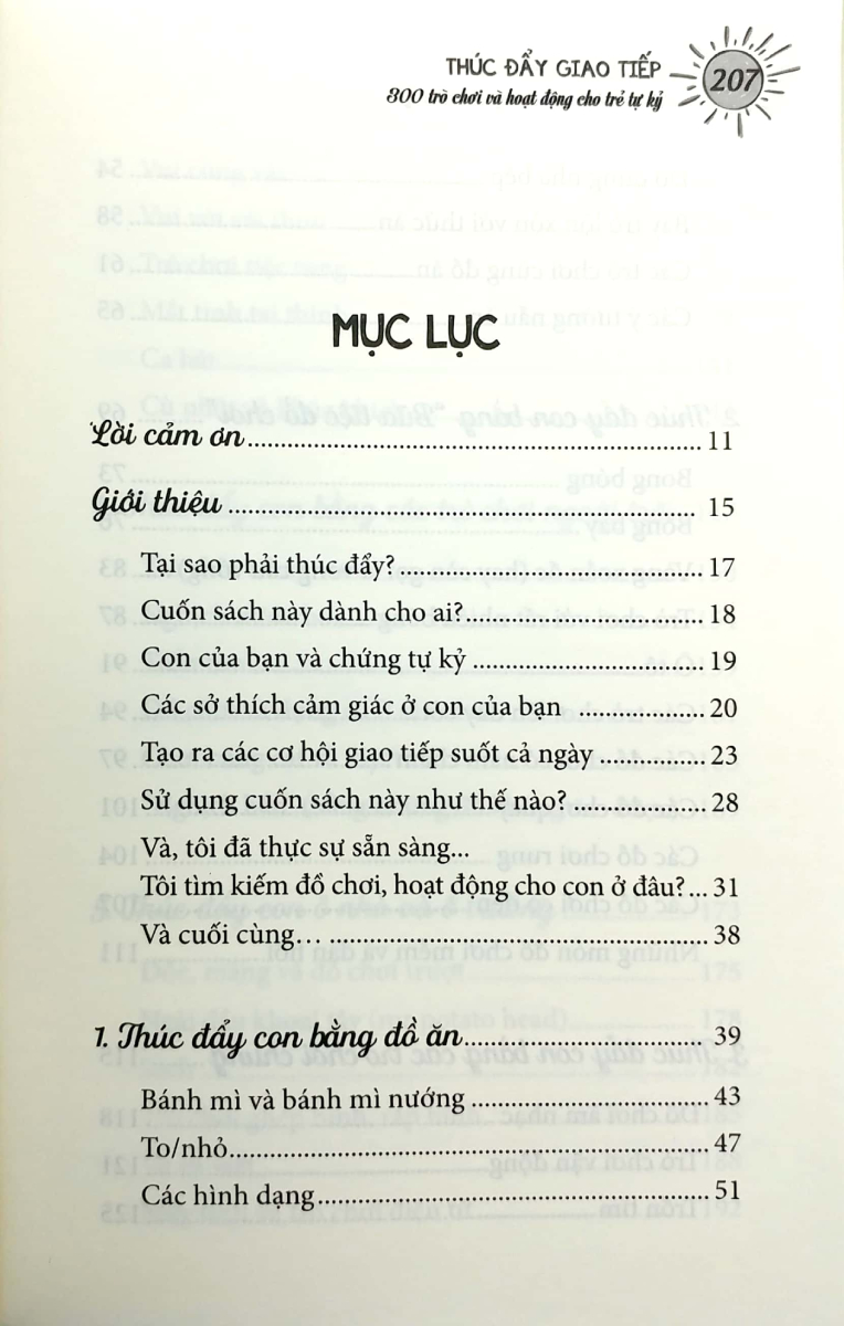 Thúc Đẩy Giao Tiếp - 300 Trò Chơi Và Các Hoạt Động Cho Trẻ Tự Kỷ Thúc Đẩy Giao Tiếp là một công cụ hoàn hảo để hỗ trợ cha mẹ, người chăm sóc và các chuyên gia trong việc thúc đẩy và phát triển các kỹ năng giao tiếp của trẻ em có rối loạn ở tất cả phổ tự kỷ. Đây là một cuốn sách chứa đựng đầy các ý tưởng thực tế và thú vị cùng với các hướng dẫn thực hiện tạo động lực cho trẻ em tự kỷ và trẻ em có các khó khăn trong giao tiếp. Cách thức trình bày rõ ràng, thân thiện tạo điều kiện cho người đọc tiếp cận nhanh với 300 trò chơi và các hoạt động thực hành rất thú vị để phát triển các kỹ năng giao tiếp của con bạn. Cuốn sách gợi ý những cách sáng tạo để sử dụng đồ chơi và các đồ vật hằng ngày. Ví dụ, nếu con bạn thích thổi bong bóng, có thể con cũng muốn đếm bóng, dùng cây đũa bắt bong bóng, giẫm bong bóng bằng chân hoặc thậm chí chơi bóng chuyền bong bóng! Những ý tưởng sáng tạo trong cuốn sách này đã được phát triển qua hơn 40 năm kinh nghiệm lâm sàng và giáo dục, và được thiết kế để cho cả người lớn và trẻ em cùng vui chơi. Tất cả các tài nguyên được đề cập trong cuốn sách này đều có sẵn và có thể được sử dụng để nâng cao kỹ năng giao tiếp ở tất cả các cấp, từ tiếp cận với một vật dụng, đến mở rộng giao tiếp bằng lời nói .