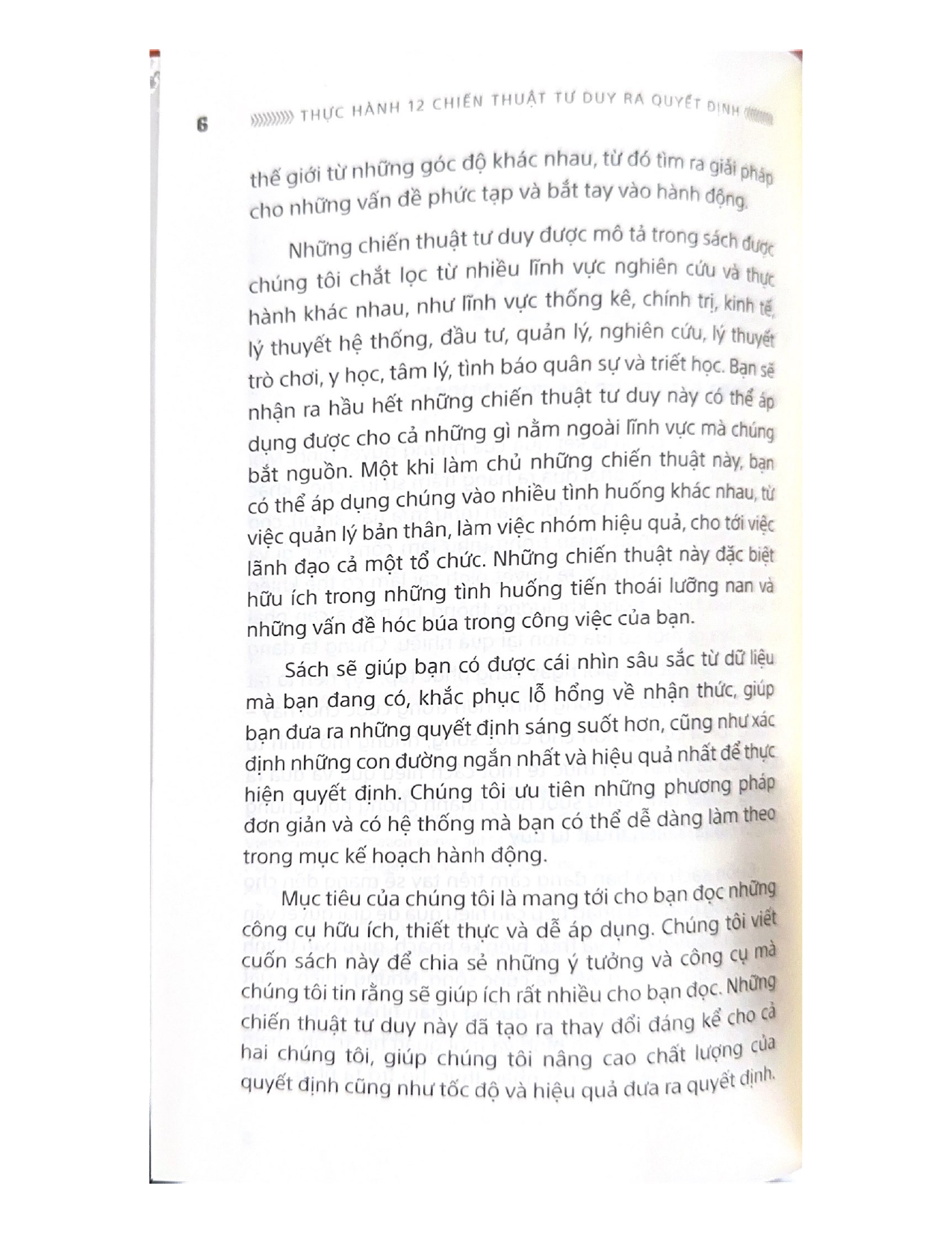- Giới thiệu Thực Hành 12 Chiến Thuật Tư Duy Ra Quyết Định Cuộc sống chính là kết quả của những quyết định. Mỗi ngày, chúng ta đều phải đưa ra hàng trăm sự lựa chọn khác nhau: từ những lựa chọn đơn giản (như trưa nay ăn gì), cho đến những lựa chọn quan trọng (như làm công việc gì và sống ở đâu). Chúng ta đang sống trong một thế giới ngày càng phức tạp, vậy nên rất cần những mô hình tư duy giúp ta phân tích thực tế một cách hiệu quả và đưa ra những quyết định sáng suốt hơn, nhanh chóng hơn. Cuốn sách mà bạn đang cầm trên tay sẽ mang đến nhiều ví dụ, công cụ và chiến thuật hữu ích để bạn nâng cao chất lượng, tốc độ và hiệu quả đưa ra quyết định. Khi làm chủ được những chiến thuật trong sách, bạn sẽ dễ dàng vượt qua các tình huống tiến thoái lưỡng nan và những vấn đề hóc búa, từ đó thành công hơn trong cả công việc lẫn cuộc sống.