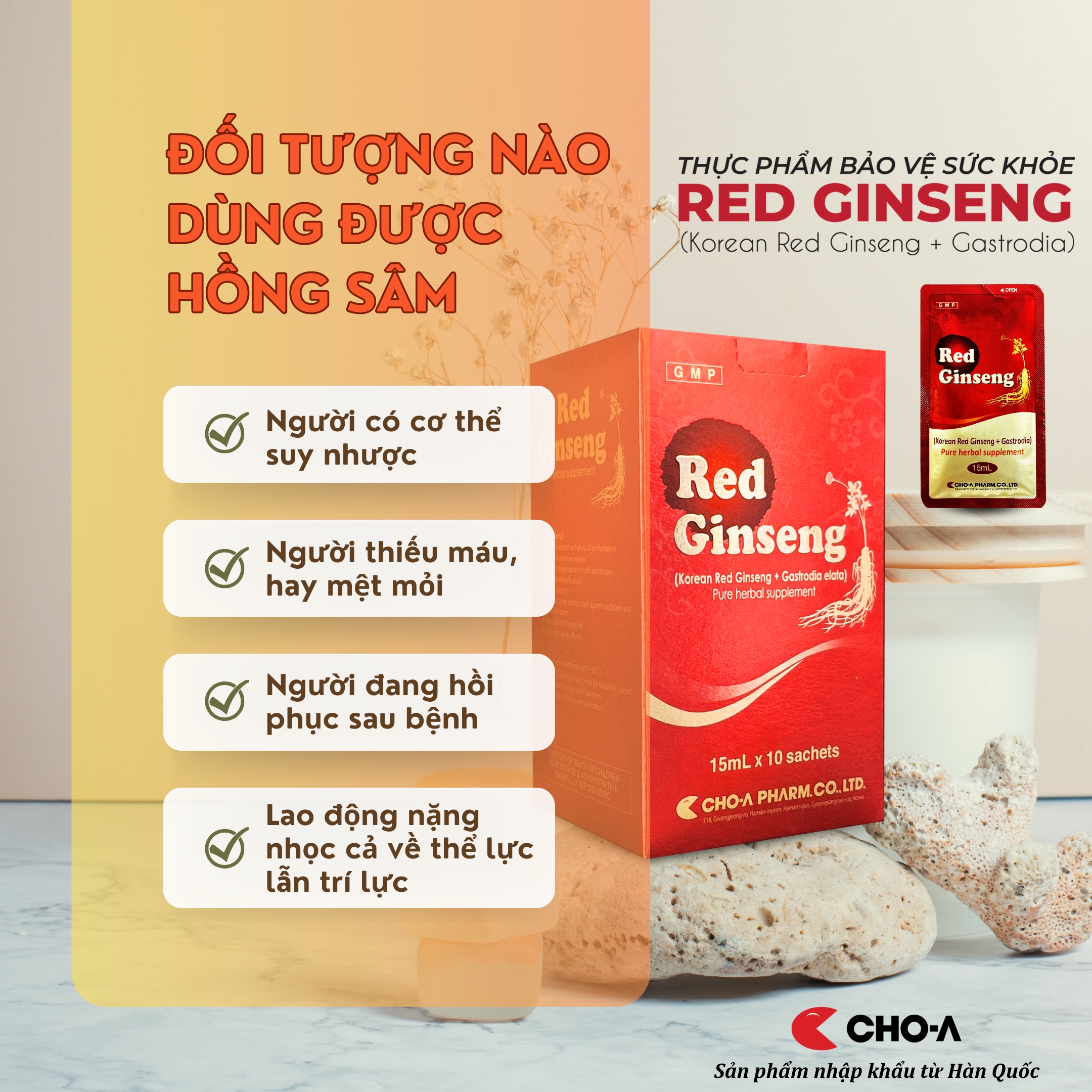 THỰC PHẨM BẢO VỆ SỨC KHỎE RED GINSENG CẢI THIỆN HỆ MIỄN DỊCH (HỘP X 10 GÓI) Red Ginseng có xuất xứ từ Hàn Quốc, được sản xuất bởi nhà máy Dược Phẩm CHOA PHARM. CO., LTD, áp dụng quy trình sản xuất và kiểm duyệt chất lượng tiên tiến. Công Dụng: