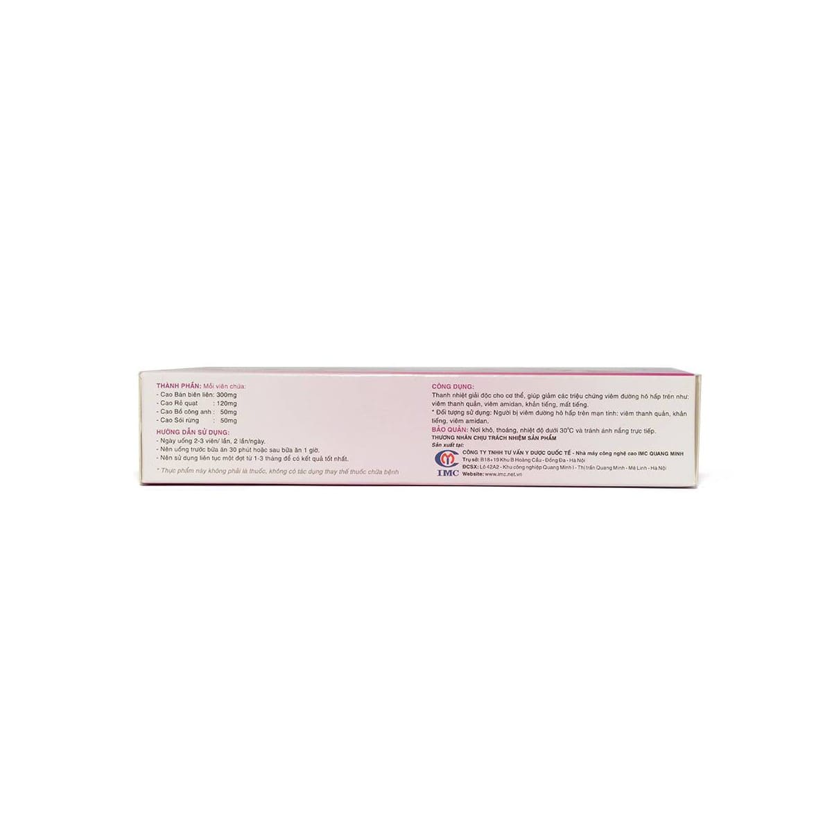 - Phụ liệu: Chất độn microcrystalline cellulose, chất chống đông vón talc và magnesium stearate, chất làm bóng polyvinyl alcohol, chất màu tổng hợp titanium dioxide vừa đủ. Công dụng Thanh nhiệt, giúp giảm các triệu chứng: Ho, đau họng, viêm thanh quản, khản tiếng, mất tiếng, viêm phế quản. Đối tượng sử dụng Người bị viêm họng, khản tiếng, mất tiếng, viêm thanh quản. Cách dùng