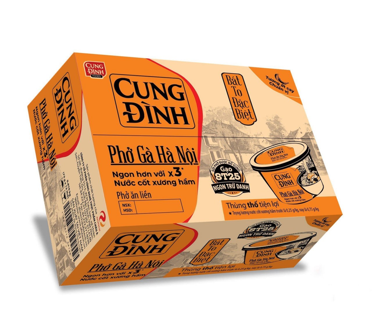 - Thùng 12 Hộp Phở Gà Hà Nội Cung Đình (73g/ Hộp) với nước cốt xương hầm và tương ớt chuẩn vị Hà Thành, chỉ cần vài phút cho khâu chuẩn bị và chế biến