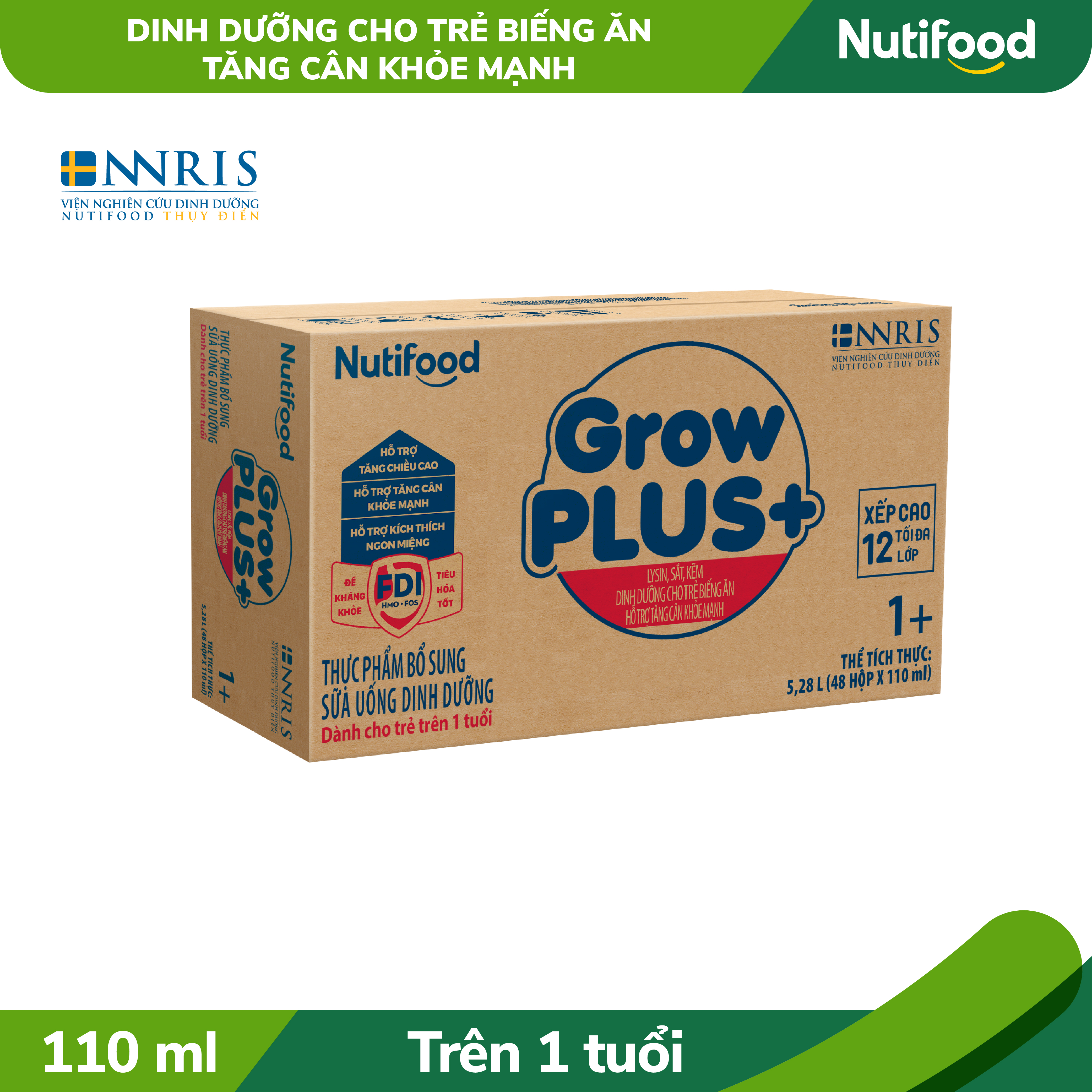 Mô tả sản phẩm: GrowPLUS+ Dinh dưỡng cho trẻ Biếng ăn Tăng cân khỏe mạnh với công thức FDI, là sự kết hợp giữa thành tựu khoa học tiên tiến của Nutifood Thụy Điển cùng sự thấu hiểu thể trạng đặc thù của trẻ em Việt Nam của các Chuyên gia dinh dưỡng Nutifood trong 20 năm qua. Đây là công thức xây dựng trên nền tảng “Đề kháng khỏe, Tiêu hóa tốt” được bổ sung 2’-FL HMO nhập khẩu 100% từ Châu Âu, kết hợp cùng FOS, Inulin giúp hấp thu các dưỡng chất, tăng cường sức khỏe hệ tiêu hóa và sức đề kháng. GrowPLUS+ giàu năng lượng, chất đạm, chất béo, bổ sung thêm MCT, Lysin, Sắt, Kẽm... cho trẻ