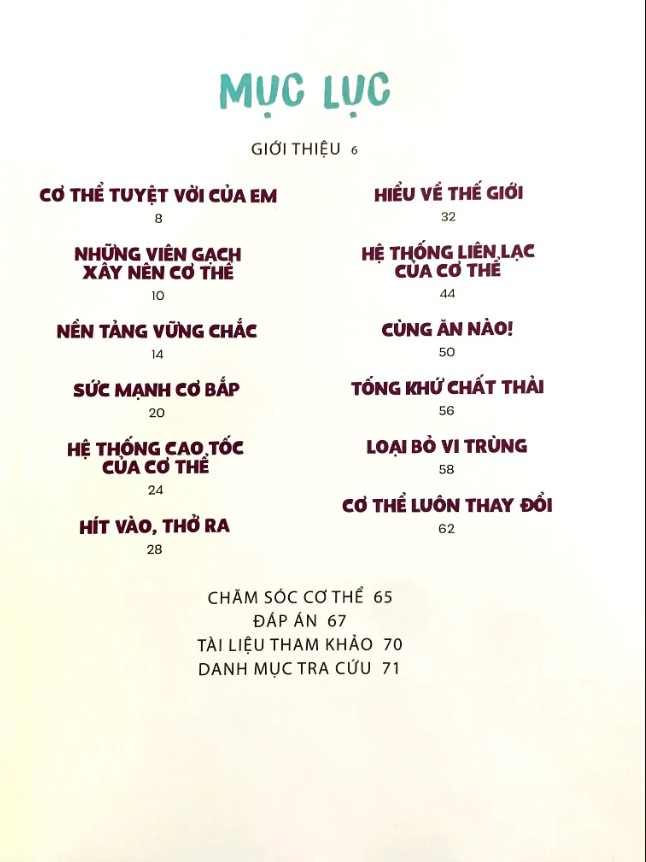 Bài học: Cuốn sách này gồm 20 bài học chia thành năm chương. Mỗi bài học tập trung vào một yếu tố cơ bản của tự nhiên và cho em một mục tiêu. Ví dụ ở chương 1, mục tiêu của Các pha của Mặt trăng ở trang 16 giúp em hiểu vì sao Mặt trăng thay đổi trong tháng.