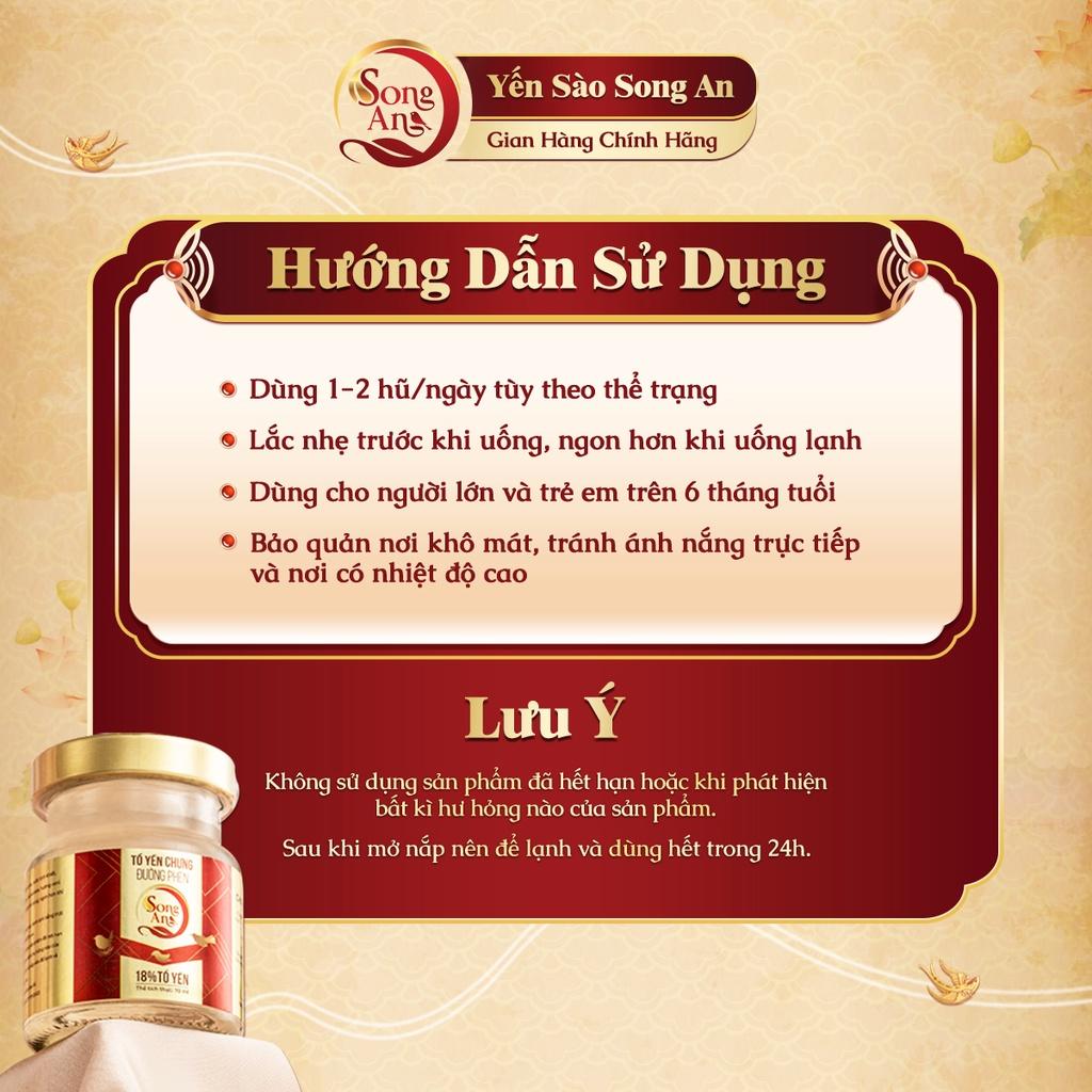 - Yến sào: Hỗ trợ tăng sức đề kháng cho cơ thể, chống lão hóa, ổn định thần kinh, trí nhớ, kích thích tiêu hóa, phục hồi sức khỏe nhanh chóng trong thời gian dưỡng bệnh. Đối tượng sử dụng: thích hợp cho mọi đối tượng đăc biệt trẻ từ 3 tuổi trở lên Sản xuất: Việt Nam Thành phần: Nước, , Yến sào (25%), đường phèn (4%) , chất ổn định (E406), hương liệu dùng cho thực phẩm. Cách dùng: - Lắc nhẹ trước khi uống, ngon hơn khi uống lạnh, tránh đun nóng sản phẩm trước khi sử dụng. - Uống trực tiếp từ lọ. --Uống từ 1 - 2 lọ/ngày. Sản phẩm thích hợp cho người lớn tăng sức đề kháng giúp cơ thể khỏe mạnh, phục hồi sức khỏe cho người bệnh, Không sử dụng sản phẩm khi hết hạn, nên sử dụng một lần sau khi mở nắp.