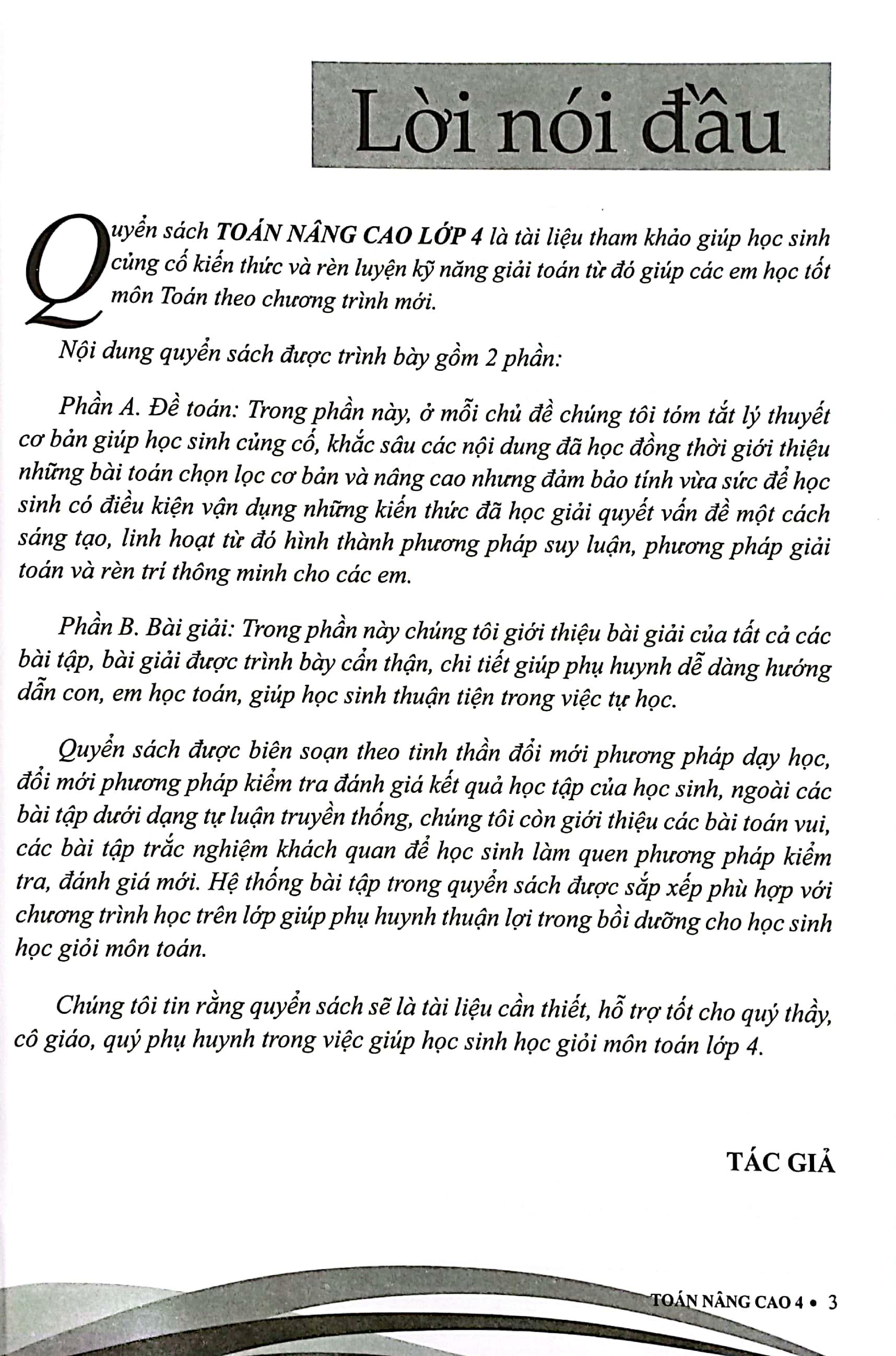 Nhằm giúp học sinh tiểu học có thể tự rèn luyện kiến thức Toán trong chương trình và sách giáo khoa đồng thời ôn luyện và nâng cao kiến thức. Sách Toán Nâng Cao 4 dành cho học sinh từ lớp 4, được biên soạn và hướng dẫn giải theo phương pháp tự luận. Bộ sách sẽ giúp học sinh tự ôn tập lý thuyết và rèn luyện, nâng cao khả năng phân tích đề bài và sáng tạo trong giải toán. Mong rằng bộ sách sẽ là công cụ hữu ích cùng các em tiếp cận sâu hơn kiến thức trong nhà trường cũng như khám phá ra nhiều điều lý thú mới của môn Toán.