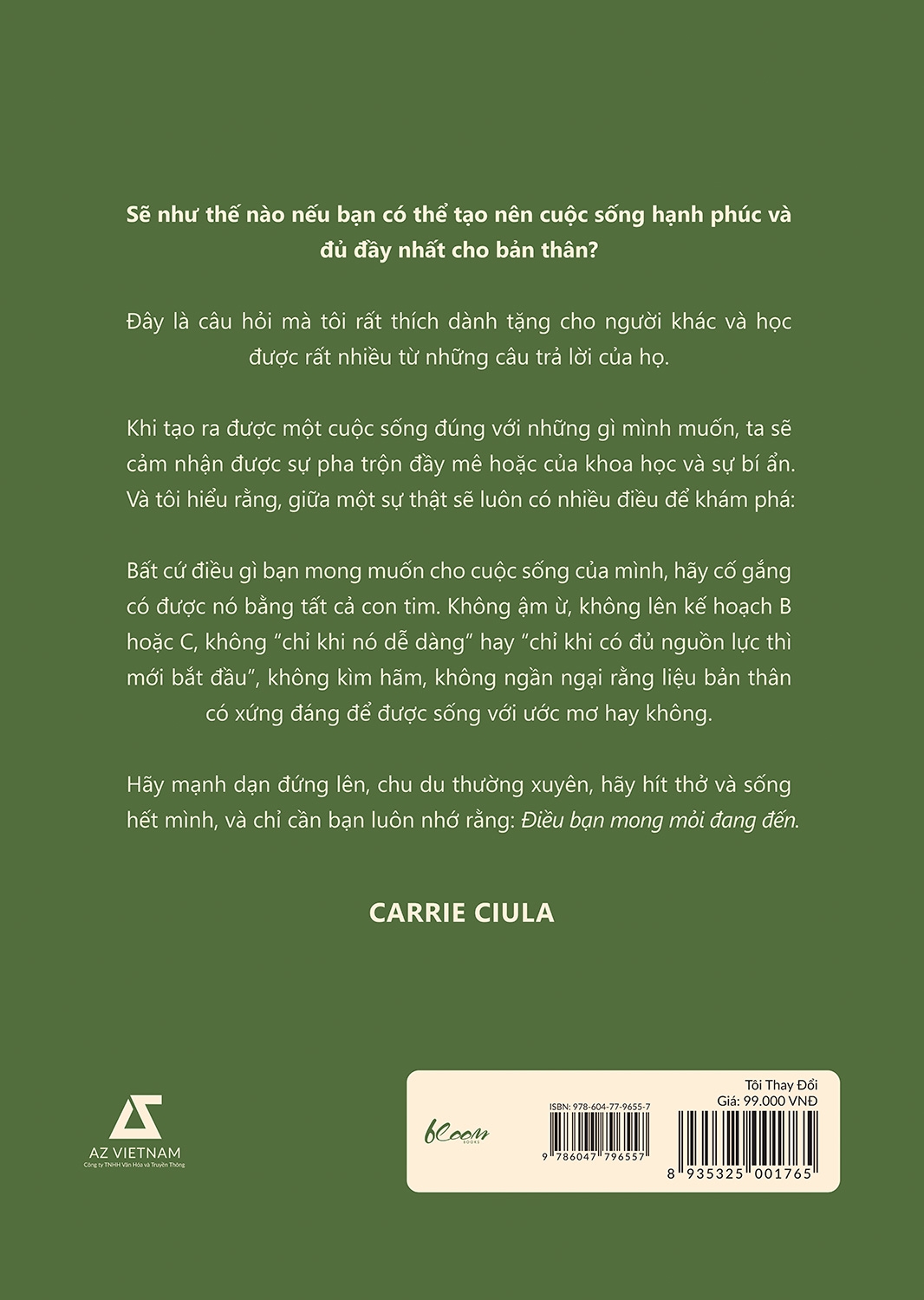 Tôi Thay Đổi - 9 Thần Chú Mở Khóa Tôi Trọn Vẹn Đầy đủ, khoa học và toàn diện, "Tôi Thay Đổi" là sự chắt lọc những năm tháng nghiên cứu và kinh nghiệm của Carrie Ciula trong các lĩnh vực dinh dưỡng, vận động, thư giãn, thanh lọc, kết nối và tình yêu – những “chìa khóa” tạo nên một cuộc đời trọn vẹn. Carrie Ciula đã “tích hợp” chín câu thần chú “Tôi được…” trong cuốn sách đầu tay của mình để đơn giản hóa các chủ đề tưởng chừng như phức tạp: