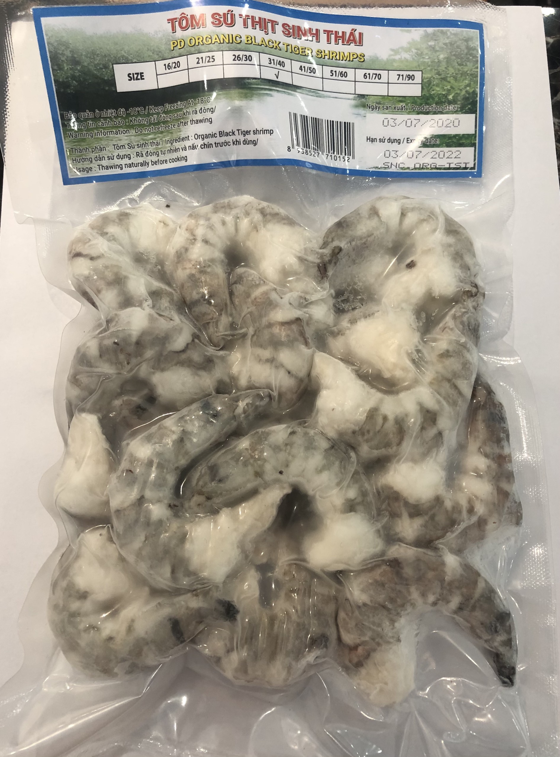 ***Tôm sú thịt sinh thái đông lạnh được đóng túi, cấp đông lúc tươi, tôm khi rã đông đảm bảo vẫn giữ được độ ngon và vị ngọt của tôm.