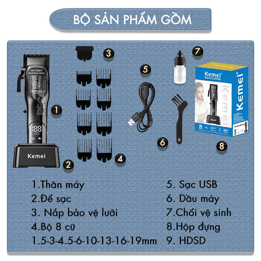 • Hoạt động êm ái: Mặc dù động cơ mạnh mẽ, máy vẫn hoạt động rất êm ái, không gây ra tiếng ồn lớn, tạo sự thoải mái cho người sử dụng cũng như khách hàng trong môi trường chuyên nghiệp. 4/ Tốc độ cắt: Máy hoạt động với mức tốc độ cao 8100 RPM giúp cắt nhanh và dễ dàng tóc dày, mỏng,...giúp tránh gây hư hại cho tóc và đảm bảo độ chính xác. Điều này không chỉ tối ưu hiệu quả cắt tóc mà còn bảo vệ thiết bị và kéo dài tuổi thọ của máy. 5/ Màn hình LCD hiển thị Tông đơ cắt tóc Kemei KM-1766 được trang bị màn hình LCD hiện đại, cung cấp thông tin cần thiết cho người dùng và tăng cường trải nghiệm sử dụng: Hiển thị trạng thái pin sạc, cảnh báo sạc, mức tốc độ. 6/ Dung lượng pin sạc Viên pin Lithium-ion dung lượng khủng lên đến 2500mAh, sạc nhanh USB chỉ trong 3h thời gian sử dụng lên đến 200 phút Sử dụng sạc USB đa dạng phương pháp sạc có thể sử dụng dùng điện thoai, máy tính, xe hơi, sạc dự phòng,...   Bộ sản phẩm bao gồm: 1 tông đơ, 8 cữ lược, 1 nắp bảo vệ lưỡi, 1 đế sạc, 1 dây sạc USB, chổi vệ sinh, dầu máy, HDSD, hộp đựng LƯU Ý KHI SỬ DỤNG: ️ Không sử dụng Tông đơ trong phòng tắm hay những nơi ẩm ướt. ️ Không sạc pin quá 24h, Cất giữ sản phẩm nơi thoáng mát, tránh ánh sáng mặt trời; khi sạc pin không để sản phẩm gần các nguồn phát nhiệt. ️ Không ấn trực tiếp đầu lưỡi cắt quá mạnh vào da có thể gây tổn thương da. ️ Các cạnh của lưỡi cắt được sản xuất với độ chính xác cao, tránh va đập mạnh với bề mặt cứng. Nếu các góc cạnh bị hư hỏng hoặc biến dạng có thể gây tổn thương da khi sử dụng. ️ Tránh xa tầm tay trẻ em.   Thông số kỹ thuật: Thương hiệu Kemei Model KM-1766 Chất liệu ABS Công suất 5W Điện áp 5V Sạc USB Dung lượng pin 2500mAh Đầu vào DC 5V Thời gian sạc 3 Giờ Thời gian sử dụng 200 Phút Phương pháp sạc USB Trọng lượng 299 gram Kích thước sản phẩm 18x 5.2 cm Màu sắc Đen Bộ sản phẩm bao gồm 1x thân máy, 8x cữ lược căn độ dài, 1x USB, 1x chổi vệ sinh, 1x dầu máy, 1x nắp bảo vệ lưỡi, 1 HDSD, 1x hộp đựng.