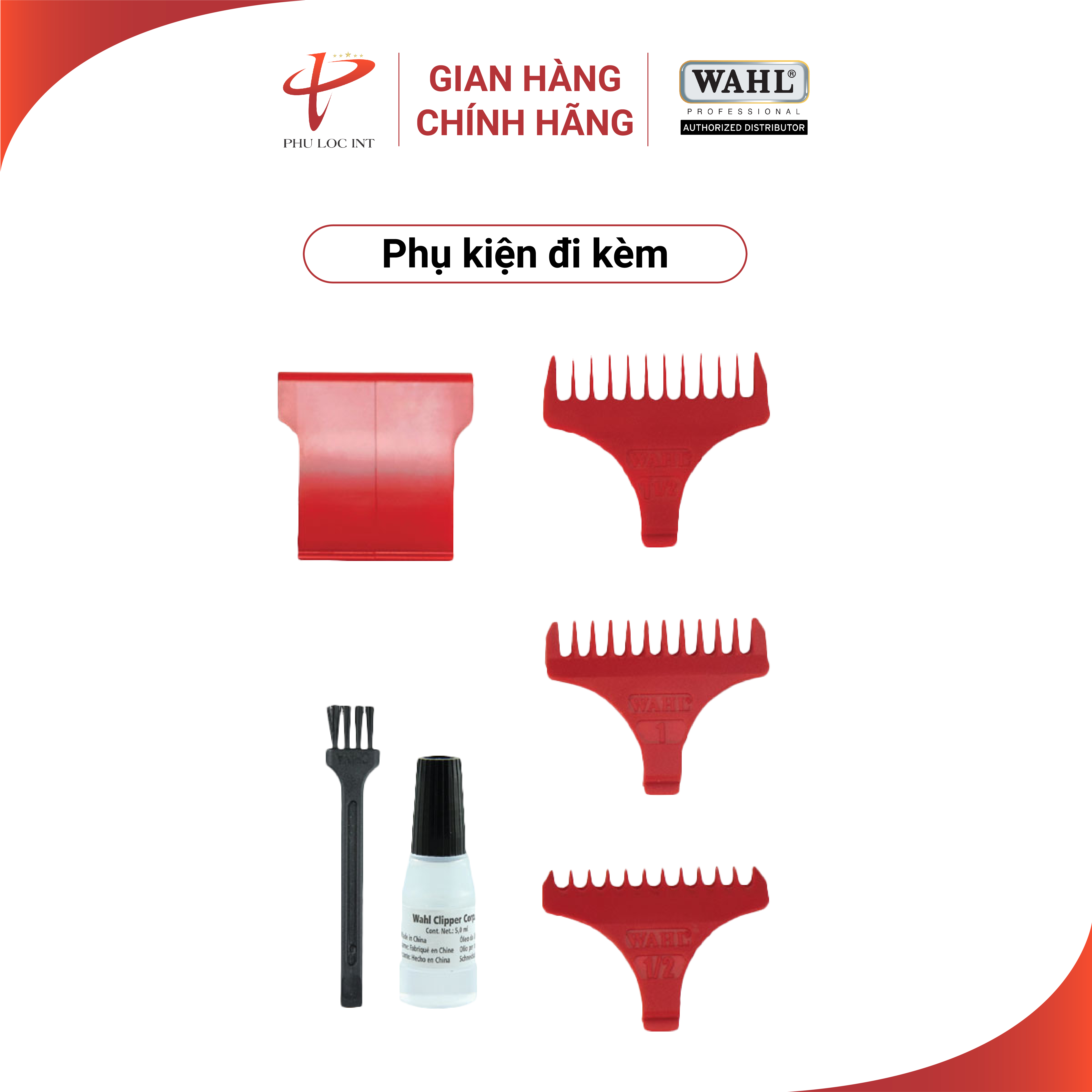 - Phụ kiện theo máy: • 3 cữ nhựa. • Dầu và chổi vệ sinh • Bảo vệ lưỡi • Sách hướng dẫn • Phiếu bảo hành