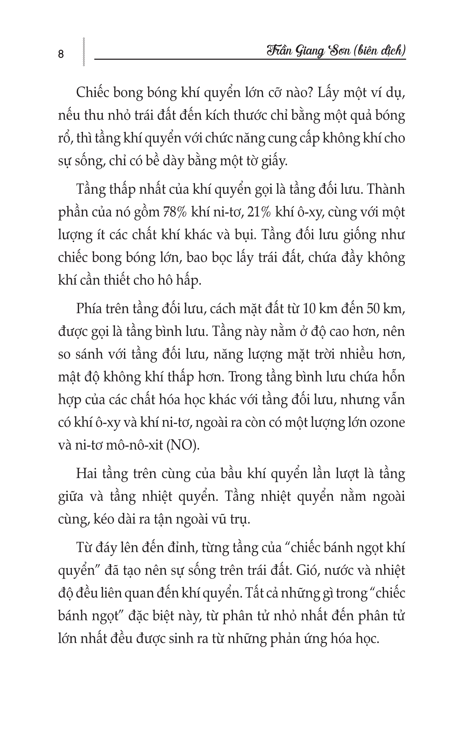 Khi tìm kiếm một hành tinh khác để di cư, vấn đề đầu tiên cần khảo sát là khí quyển của hành tinh đó. Cần xem tầng khí quyển của hành tinh đó liệu có độ ẩm thích hợp hay không, trong khí quyển có chất khí để con người có thể hô hấp hay không, “hệ thống cung cấp nhiệt” của lớp khí quyển không được quá nóng cũng không được quá lạnh, đồng thời cần phải phòng chống được tia bức xạ. Lớp khí quyển của trái đất không phải vừa sinh ra đã giống như ngày hôm nay. Trái đất được hình thành cách đây khoảng 4.5 tỷ năm. Cho đến mãi 2,4 tỷ năm trước, phân tử ô-xy tự do mới bắt đầu xuất hiện. Cách đây khoảng vài trăm triệu năm mới có lớp khí quyển 4 tầng như ngày nay, và cũng mới có loài người chúng ta.             Khí quyển không phải là không bị thay đổi. Nhưng khi bị ô nhiễm, thì nó sẽ bị biến đổi nhanh. Việc đốt than đá quá nhiều trong thời kỳ cách mạng công nghiệp khiến cho London trở thành thành phố sương mù. Khí thải xe ô tô và khí thải công nghiệp khiến cho Los Angeles bị sương mù quang hóa. Những chất gây ô nhiễm không khí trực tiếp gây ra sự đau khổ và chết chóc cho sinh vật trên trái đất.             Trong cuốn sách này, chúng ta cùng tìm hiểu các chất gây ô nhiễm khí quyển. Bạn sẽ phát hiện, việc xử lý rất nhiều các chất gây ô nhiễm đều là cuộc đấu tranh với lợi ích và thói quen của con người. Chẳng hạn, việc nghiêm cấm sử dụng xăng chứa chì gây tổn hại cho ngành công nghiệp hóa học, việc đưa ra các tiêu chuẩn nghiêm ngặt đối với khí thải xe hơi đã đe dọa ngành công nghiệp xe hơi. Thậm chí, hạn chế lái xe hơi và đốt than, đều ảnh hưởng đến thói quen sinh hoạt của con người. Bạn cũng hiểu được rằng, bây giờ có thể dùng phương pháp gì để làm sạch khí quyển. Mỗi một đồ vật mà chúng ta sử dụng đều có nguồn gốc, và có một nơi để đi về. Chúng ta không muốn rằng cuối cùng chúng sẽ biến thành vật gây ô nhiễm. Không khí trong lành là báu vật có giá trị nhất đối với loài người.