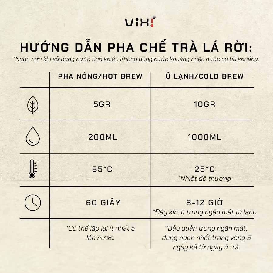 – Pha lạnh: Ủ 10gr trà lá rời với 1000ml nước ở nhiệt độ thường (25 độ C), có thể thưởng thức sau 8-12 giờ.