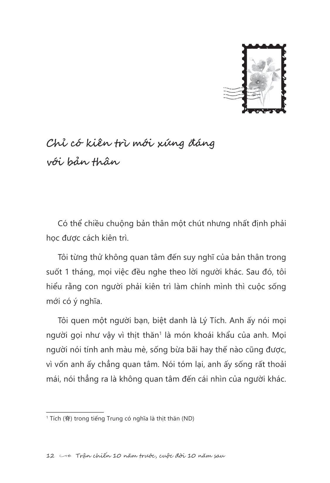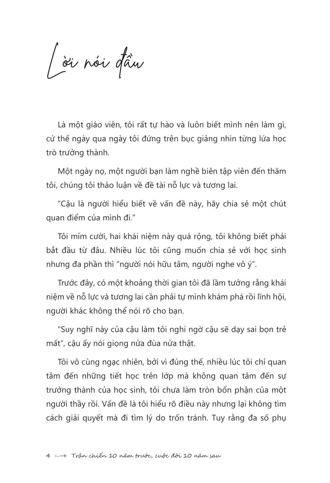 Trận Chiến 10 Năm Trước, Cuộc Đời 10 Năm Sau “Nếu chúng ta cho rằng bình phàm là đáng quý, ta sẽ hài lòng với bản thân của hiện tại, lựa chọn những điều dễ dàng, sống cho qua ngày mà quên mất trên đời có những người không màng tất cả để sống đời huy hoàng rực rỡ.” Các bạn trẻ, tương lai của các bạn đang được xây dựng và tích lũy dựa trên những quyết tâm ở ngay giây phút này. Vậy nên tuổi trẻ đừng chọn an nhàn, đừng tính toán thiệt hơn, đừng trì hoãn các mục tiêu, đừng nhụt chí sau thất bại. Trận chiến 10 năm trước chính là cuộc đời của bạn 10 năm sau!