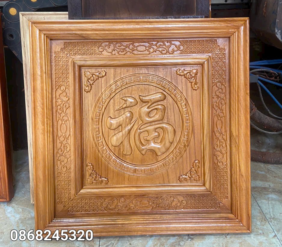 _ Tranh chữ phúc được làm bằng chất liệu gỗ gõ tự nhiên 100% _ Kt mặt vuông 61×61×4cm _ Tranh được khắc nổi tỉ mỉ ,tinh xảo kỳ công .Từ những người thợ giàu