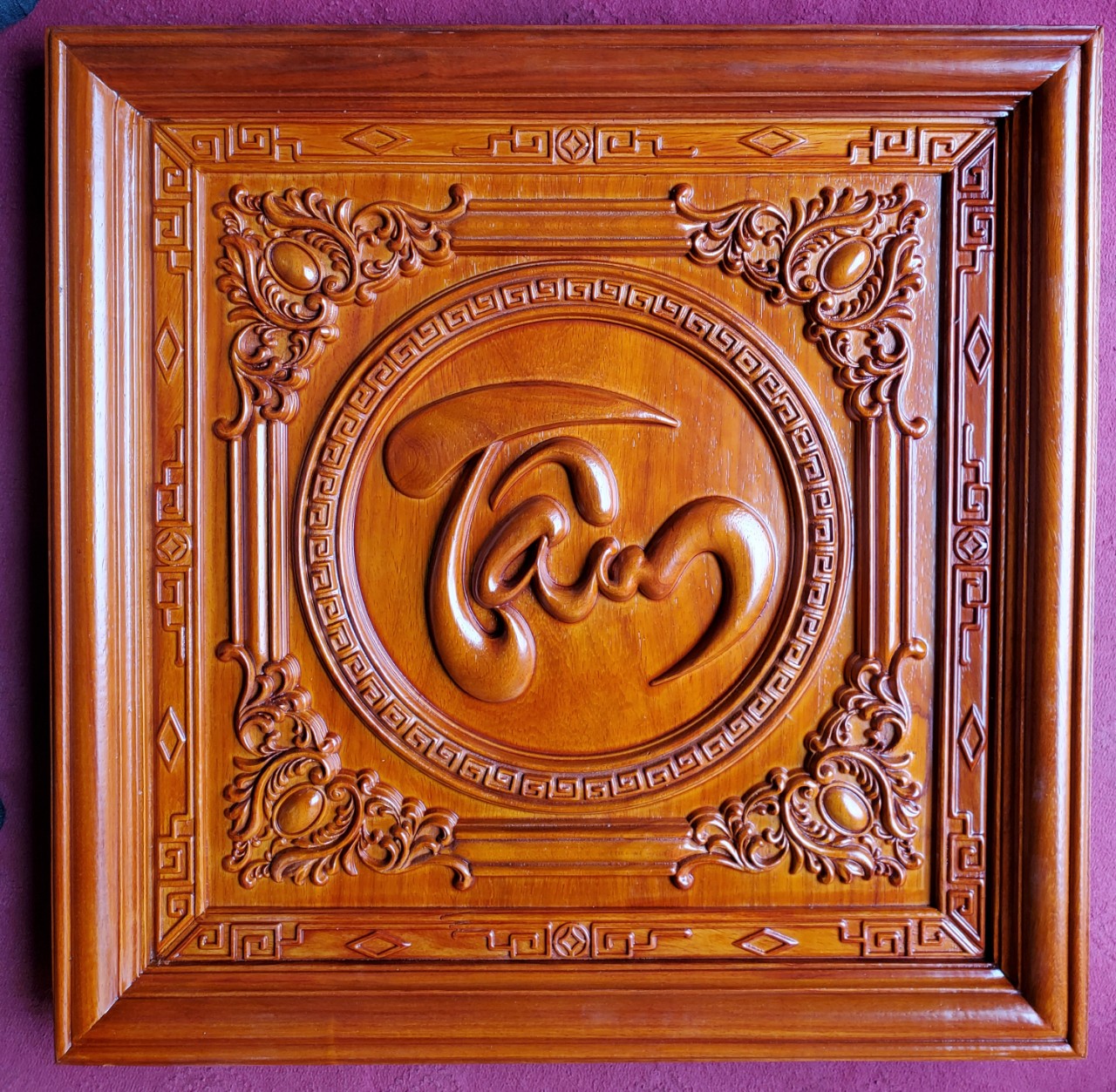 _ Tranh chữ phúc được làm bằng chất liệu gỗ gõ tự nhiên 100% _ Kt mặt vuông 61×61×4cm _ Tranh được khắc nổi tỉ mỉ ,tinh xảo kỳ công .Từ những người thợ giàu