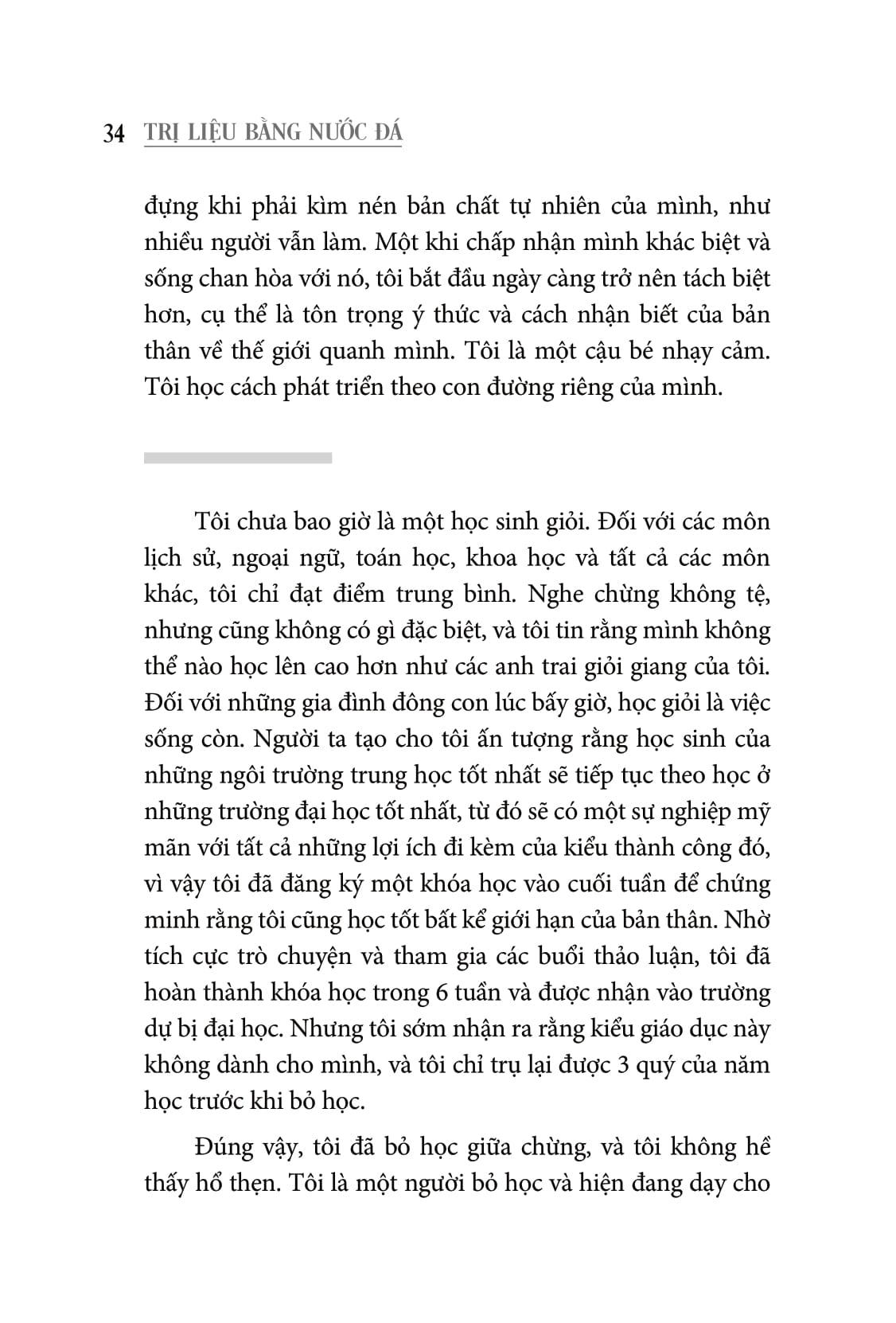 TRỊ LIỆU BẰNG NƯỚC ĐÁ Kích hoạt toàn bộ tiềm năng cơ thể với phương pháp Wim Hof Phương pháp Wim Hof là gì? Bạn muốn có nhiều năng lượng hơn, ít căng thẳng hơn và một hệ miễn dịch khỏe mạnh hơn? Bạn muốn ngủ ngon hơn, cải thiện khả năng nhận thức và vận động, cải thiện tâm trạng, giảm cân và xoa dịu lo lắng trong lòng? Vậy thì phương pháp Wim Hof sẽ cho phép bạn trau dồi cơ thể và tâm trí theo cách giải phóng tiềm năng bên trong để đạt đến trạng thái sức khỏe và sức sống dồi dào hơn bằng cách hít thở và tắm nước lạnh. Đây là cách của ông Wim Hof hay còn gọi là Icemen nổi tiếng với khả năng chạy marathon không cần nước trên sa mạc, ngâm mình dưới băng, leo Everest mặc quần cụt. Ông thực hiện cách thở này và đã được nhiều đại học nghiên cứu. Khác với trạng thái ngồi thiền, phương pháp này có những tác động mạnh mẽ, cấp bách, đòi hỏi chúng ta phải toàn tâm toàn ý và nhận thức trạng thái bên trong của cơ thể. Việc tập luyện thân-tâm theo cách này dường như có tiềm năng lớn giúp phát triển khả năng hồi phục tinh thần để đương đầu với căng thẳng. “Trị Liệu Bằng Nước Đá” đã được thử nghiệm trong các nghiên cứu thí điểm nhỏ, cho thấy hệ miễn dịch có phản ứng tích cực với endotoxin và căn bệnh viêm khớp cột sống, chứng tỏ rằng phương pháp này có thể làm giảm các triệu chứng bệnh và tình trạng viêm mạn tính. Phương pháp này đang được thử nghiệm với bệnh nhân chấn thương tủy sống – những người không có khả năng kích hoạt các hệ thống thần kinh tự chủ và tim mạch một cách dễ dàng. Phương pháp này cũng đang được những người cao tuổi thực hành, bao gồm một số thành viên trên 90 tuổi. Wim biết rằng nghiên cứu nghiêm túc là con đường dẫn đến những khám phá giúp con người có thêm nhiều cơ hội kiểm soát sức khỏe và hạnh phúc của bản thân. Trị liệu bằng nước đá - Khám phá những giới hạn của tâm trí và cơ thể Phương pháp Wim Hof có thể đẩy chúng ta vượt lên trên những giới hạn của bản thân, rằng chúng ta có thể giải phóng được tiềm năng to lớn trong cơ thể và tâm trí của mình. Cuốn sách The Wim Hof Method: Activate Your Full Human Potential này là câu chuyện thực sự về niềm đam mê, tình yêu đối với thiên nhiên, đối với muôn loài, đối với gia đình, đồng loại, và từ đó thôi thúc Wim Hof chia sẻ những hiểu biết của bản thân với hy vọng chữa lành bệnh tật. (Khi còn là một cậu bé, anh ấy cảm nhận được mối gắn kết sâu sắc với thiên nhiên, nhiều đến mức đã chủ động ngừng ăn thịt động vật vào năm 13 tuổi). Đó cũng là câu chuyện về khả năng chịu đựng và nỗ lực phấn đấu của con người – những trải nghiệm nhân văn và lòng hiếu kỳ vô bờ đã thôi thúc Wim khám phá những giới hạn của tâm trí và cơ thể. Trong "Trị Liệu Bằng Nước Đá", Wim sẽ chỉ cho chúng ta thấy mình có thể làm được gì. Phương pháp của anh đòi hỏi sức mạnh niềm tin vào bản thân, sức mạnh kết hợp giữa ý chí kiên cường và khả năng chú ý có định hướng. Khả năng thư giãn trong trạng thái không thoải mái và đau đớn về thể xác – của băng, của nước lạnh, của nín thở – là một cách tiếp cận xuất chúng. Hãy cho phép bản thân trải nghiệm Phương pháp Wim Hof và tự mình khám phá. Cứ tận hưởng bạn nhé!
