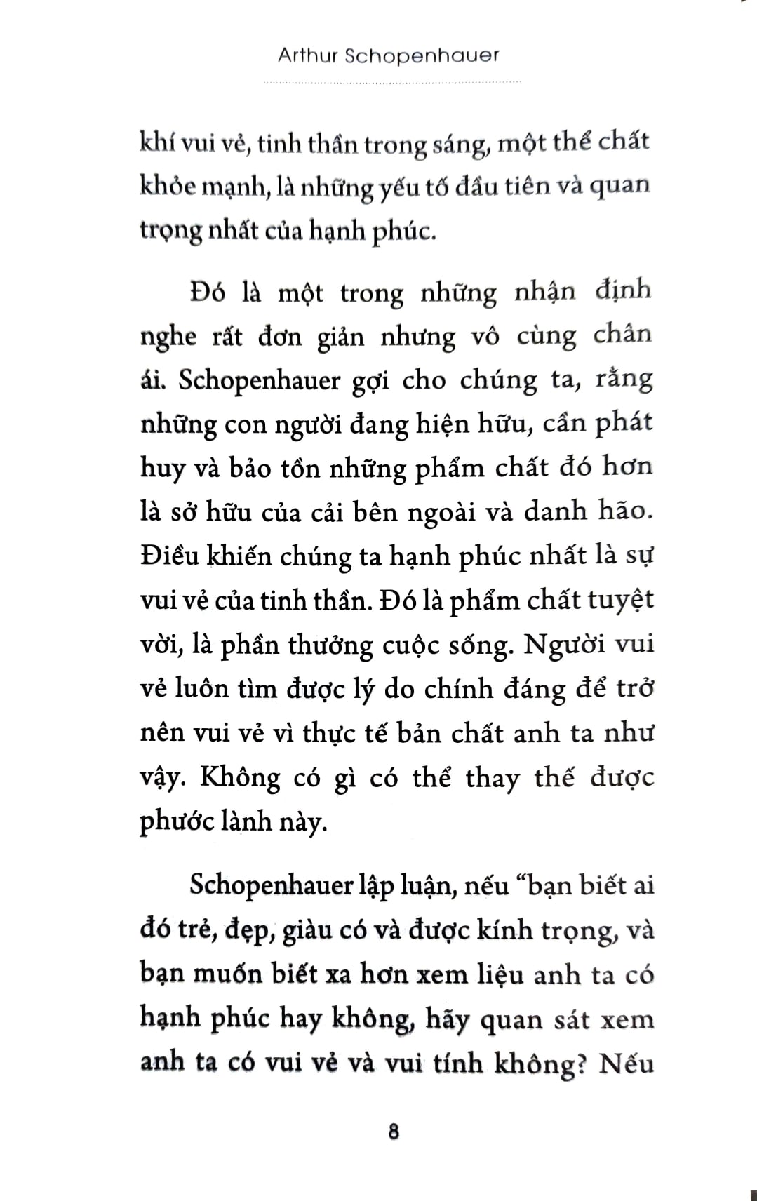 Trí Tuệ Nhân Sinh GIỚI THIỆU TÁC GIẢ: Arthur Schopenhauer, một trong những triết gia vĩ đại của nước Đức, nổi tiếng với những quan điểm đầy sáng tạo và phản biện sâu sắc về cuộc sống và nhân sinh. Ông được biết đến với việc khuyến khích một lối sống đơn giản, khổ hạnh và chay tịnh, mặc dù trong cuộc sống cá nhân ông lại thích ăn thịt, uống rượu vang và mê mẩn phụ nữ. Schopenhauer đã mở rộng và phát triển triết lý Kant về cách con người trải nghiệm thế giới, đặc biệt là trong việc khám phá sâu sắc về bản chất của khổ đau và sự vô ích trong cuộc sống. Triết gia này không chỉ nổi tiếng với sự độc lập tư tưởng mà còn với sự dám nghĩ, dám nói và sự sâu sắc về tâm lý con người, tạo nên dấu ấn sâu sắc trong lịch sử triết học thế giới. GIỚI THIỆU TÁC PHẨM: TRÍ TUỆ NHÂN SINH – CUỘC DẠO CHƠI CỦA MỘT “ĐỘC CÔ” GIỮA CUỘC ĐỜI. Trí Tuệ Nhân Sinh của Arthur Schopenhauer là một tác phẩm triết học sâu sắc về hạnh phúc và ý nghĩa cuộc sống. Trong cuốn sách này, Schopenhauer đề cập nhiều điều thú vị mà bạn đọc có thể chiêm nghiệm và tự rút ra cho mình những bài học quý giá. Ông cho rằng, những gì một người có ở bản thân mình, cùng với mục tiêu cuộc sống của anh ta, là yếu tố trực tiếp dẫn đến hạnh phúc và phúc lợi của người đó. Tất cả những thứ khác chỉ là trung gian và gián tiếp và ít bị ảnh hưởng. Schopenhauer lập luận, con người có thể dễ dàng chịu đựng một điều bất hạnh đến từ bên ngoài dễ dàng hơn là điều bất hạnh từ bên trong. Vận mệnh có thể thay đổi, nhưng tính cách thì không. Vì vậy, những phước lành từ chủ quan, một bản chất cao thượng, một cái đầu có năng lực, một tính khí vui vẻ, tinh thần trong sáng, một thể chất khỏe mạnh, là những yếu tố đầu tiên và quan trọng nhất của hạnh phúc. “Đừng nên kỳ vọng nhiều vào người khác, hay nói chung là đừng nên kỳ vọng từ thế giới bên ngoài” – như một châm ngôn đúng với bất kỳ ai! Chính bản thân mình là nguồn gốc của những điều tốt đẹp nhất mà con người có thể đạt được. Càng đúng hơn khi khẳng định – một người càng vui vẻ hạnh phúc hơn khi tìm thấy nguồn vui trong chính mình.