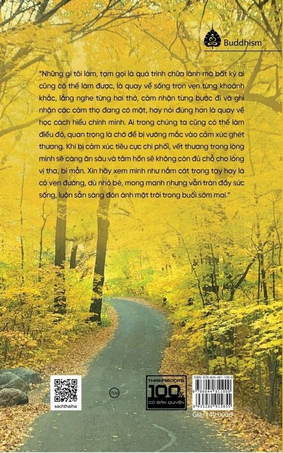 “Những gì tôi làm, tạm gọi là quá trình chữa lành mà bất kỳ ai cũng có thể làm được, là quay về sống trọn vẹn từng khoảnh khắc, lắng nghe từng hơi thở, cảm nhận từng bước đi và ghi nhận các cảm thọ đang có mặt, hay nói đúng hơn là quay về học cách hiểu chính m.ình. Ai trong chúng ta cũng có thể làm điều đó, quan trọng là chớ để bị vướng mắc vào cảm xúc ghét thương. Khi bị cảm xúc tiêu cực chi phối, vết thương trong lòng m.ình sẽ càng ăn sâu và tâm hồn sẽ không còn đủ chỗ cho lòng vị tha, bi mẫn. Xin hãy xem m.ình như nắm cát trong tay hay lá cỏ ven đường, dù nhỏ bé, mong manh nhưng vẫn tràn đầy sức sống, luôn sẵn sàng đón ánh mặt trời trong buổi sớm mai.”