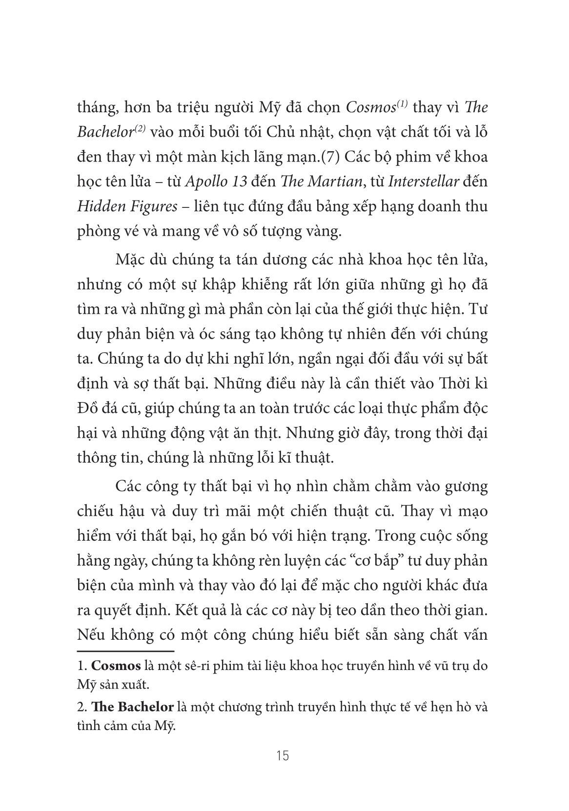 Tư duy như một nhà khoa học tên lửa là nhìn thế giới qua một lăng kính khác. Các nhà khoa học tên lửa hình dung ra những điều không tưởng và giải quyết những điều không thể giải quyết. Họ biến thất bại thành thành công và khó khăn thành lợi thế. Họi coi những rủi ro như những câu đố có thể giải được hơn là những rào cản không thể vượt qua. Họ hành động không phải bởi sự tin tưởng mù quáng mà bởi sự nghi ngờ chính bản thân; mục tiêu của họ không phải là kết quả trước mắt mà là đột phá lâu dài. Họ biết rằng các quy tắc không được thiết lập sẵn, điều mặc định có thể được thay đổi và một con đường mới có thể được tạo ra.