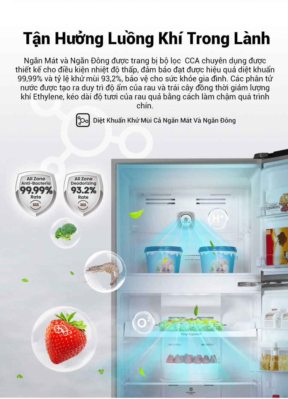 - Diệt Khuẩn Khử Mùi Cả Ngăn Mát Và Ngăn Đông, Tận Hưởng Luồng Khí Trong Lành: Ngăn Mát và Ngăn Đông được trang bị bộ lọc CCA chuyên dụng được thiết kế cho điều kiện nhiệt độ thấp, đảm bảo đạt được hiệu quả diệt khuẩn 99,99% và tỷ lệ khử mùi 93,2%, bảo vệ cho sức khỏe gia đình. Các phân tử nước được tạo ra duy trì độ ẩm của rau và trái cây đồng thời giảm lượng khí Ethylene, kéo dài độ tươi của rau quả bằng cách làm chậm quá trình chín. Ngăn Cân Bằng Độ Ẩm,Tạm Biệt Nỗi Lo Ẩm Mốc: Moisture Fresh Crisper là ngăn đựng rau quả có hệ thống điều chỉnh độ ẩm, qua đó bạn có thể điều chỉnh độ ẩm để đáp ứng các yêu cầu bảo quản thực phẩm khác nhau. Độ ẩm thích hợp có thể giúp bảo quản thực phẩm lâu hơn.