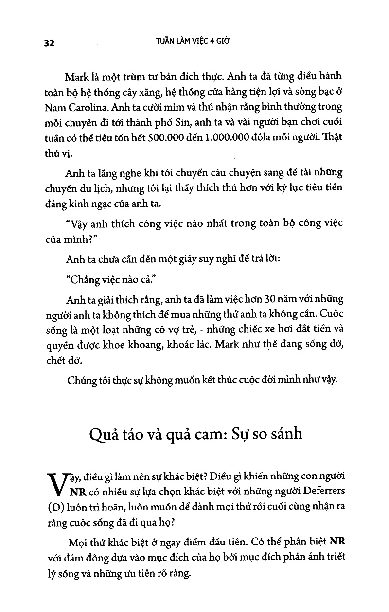 D: Definition (Xác định) Trong bước này Tim Ferriss giúp bạn thay đổi hoàn toàn những suy nghĩ sai lầm và đưa ra những qui tắc và mục đích của một phương pháp mới. Bạn sẽ có câu trả lời cho câu hỏi những nhà giàu mới (new rich) là ai và họ hành động như thế nào.