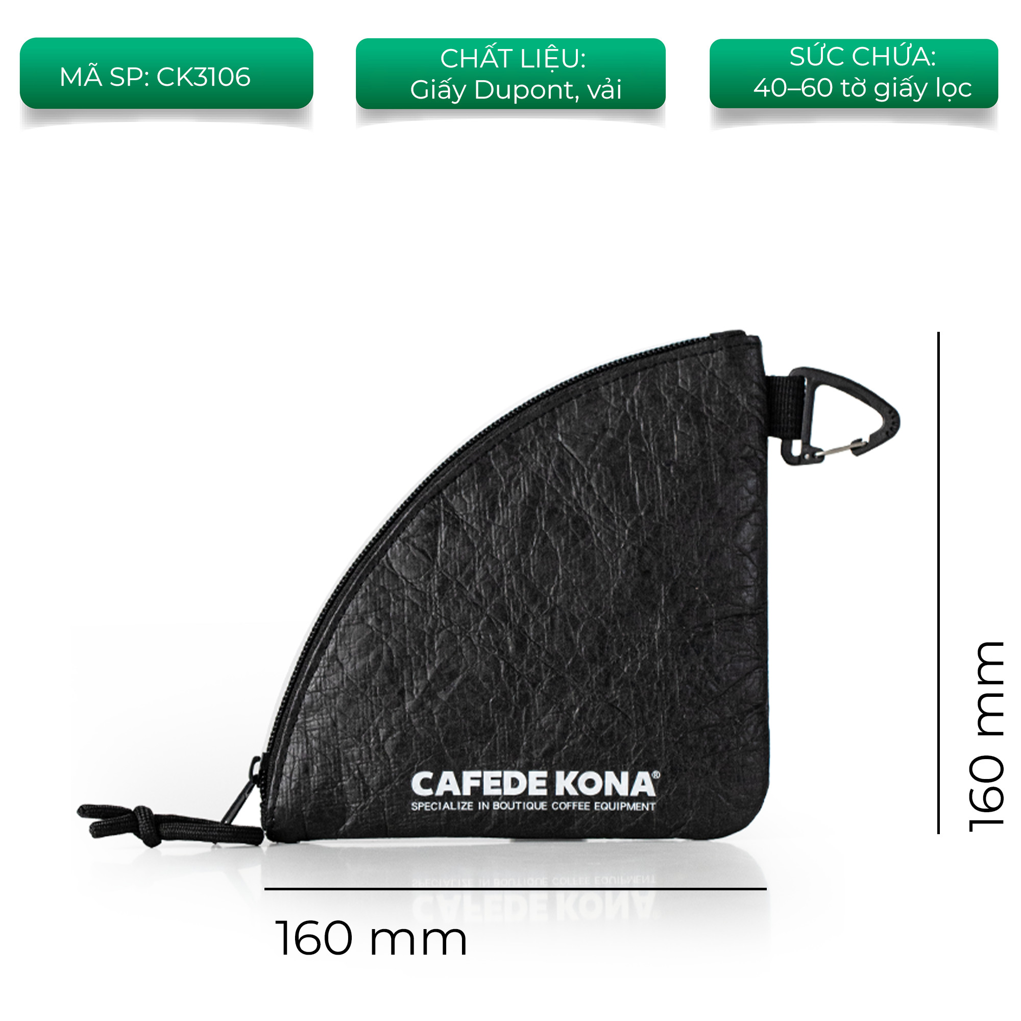 Mua tại TiktokTÚI VẢI ĐỰNG GIẤY LỌC PHA CÀ PHÊ CAFE DE KONA Túi đựng bảo quản giấy lọc với chất liệu Dupont chống thấm nước, có thể bảo vệ giấy lọc tối ưu nhất kể cả ở môi trường ngoài trời. Với thiết kế dày dặn và có khóa kéo zip bảo vệ giấy lọc không bị biên dạng, an toàn và vệ sinh. Có móc treo được thiết kế hình tam giác thuận tiện. Khóa kéo zipper giúp chống nước, chống bụi, an toàn, vệ sinh.Bảo quản giấy lọc dễ dàng và sạch sẽ. Túi có sức chưa lớn: có thể chứa từ 40 đến 60 miếng giấy lọc. Thương hiệu: CAFEDE KONA Chất liệu: Dupont chống thấm nước Sử dụng cho giấy lọc V60 và giấy lọc hình quạt