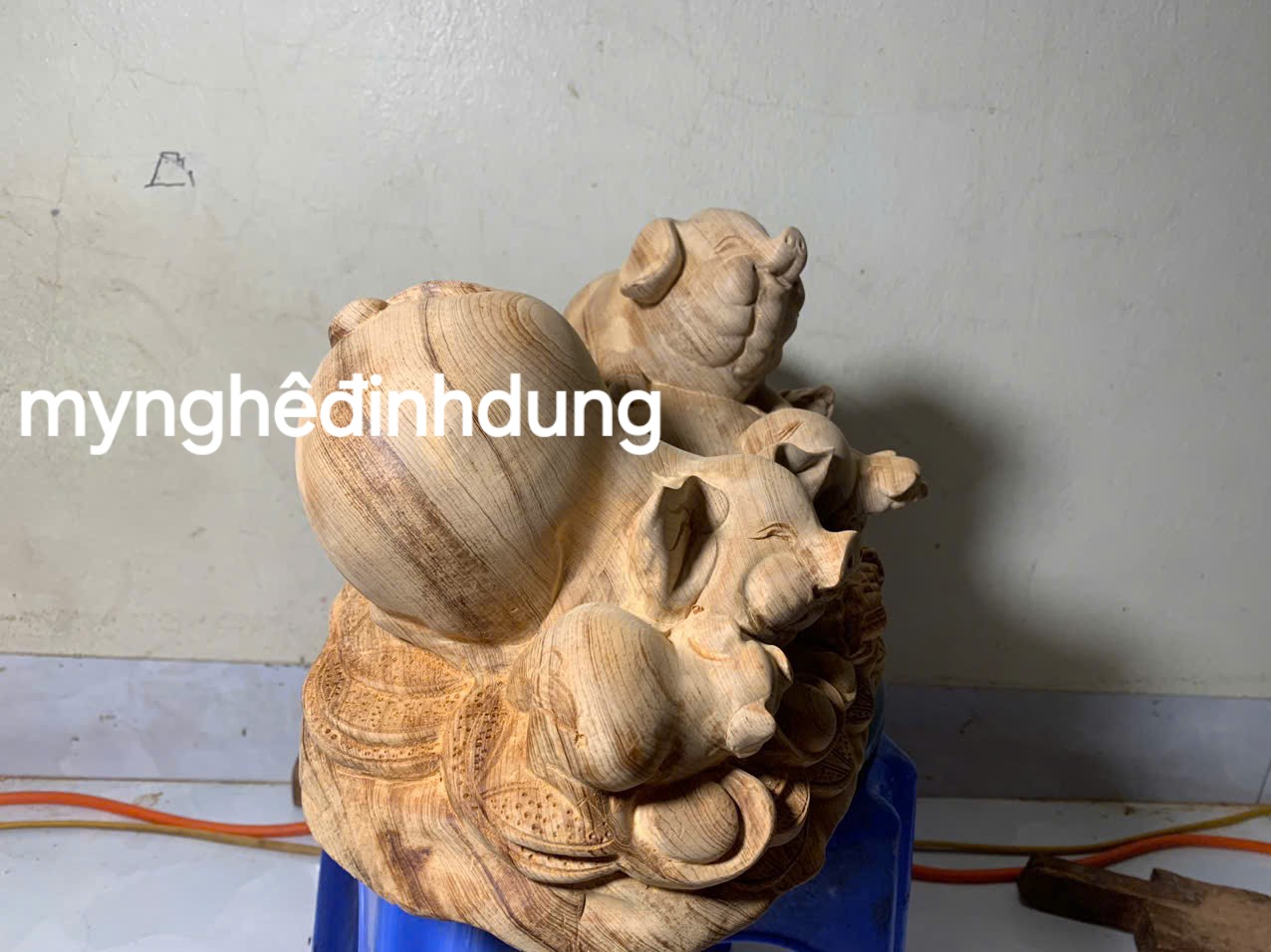 Tượng gỗ mỹ nghệ trạm con heo ôm bao tiền cười vui híp mắt gỗ gõ Dài 30cm x Cao 17cm x Ngang 14cm ý nghĩa biểu tượng giàu sang phú quý ạ - Tượng