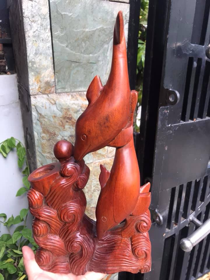 Tượng Gỗ Ống Đựng Bút Gỗ Gõ Chạm Hình 2 Con Cá Heo May Mắn TRANG TRÍ VÀ ĐỂ BÚT XINH LẮM cao 36cm x ngang 18cm x sâu 7cm đẹp lạ CÁ HEO BIỂU