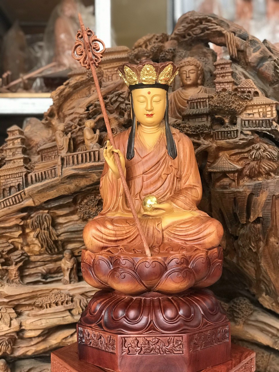 Tượng phật địa tạng vương bồ tát được làm bằng chất liệu gỗ hương đá liền khối tô làm mầu giả cổ Kích thước 50×25×25cm _ Tượng phật địa tạng vương bồ tát được trạm khắc tỉ mỉ tinh sảo kỳ công ,Tượng được làm và hoàn thiện do bàn tay khối óc tài hoa ,Từ những người thợ dầy rặn kinh nghiệm cũng như tay nghề cao trong làng nghề truyền thống .Chính vì thế tượng phật địa tạng vương bồ tát đã đáp ứng đầy đủ những tiêu trí ( Đẹp bền rẻ ) Thẩm mỹ nghệ thuật với chất lượng tuyệt vời