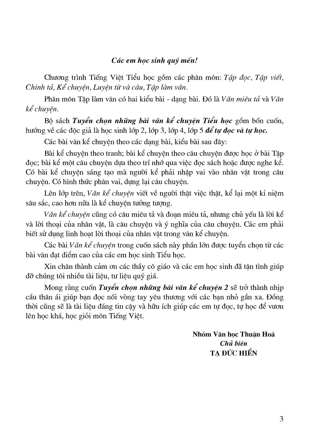 "Tuyển chọn những bài văn kể chuyện" bao gồm 4 cuốn, chia theo các lớp ở bậc tiểu học từ lớp 2 đến lớp 5. Sách được biên soạn với mong muốn giúp các em học sinh có thêm tài liệu tự đọc và tự học.Các bài văn kể chuyện theo các dạng bài, kiểu bài sau: kể chuyện theo tranh, kể chuyện theo câu chuyện được học ở bài Tập đọc, kể chuyện về một câu chuyện dựa theo trí nhớ qua việc đọc sách hoặc được nghe kể. Có bài kể chuyện sáng tạo mà người kể phải nhập vai vào nhân vật trong câu chuyện, có hình thức phân vai, dựng lại câu chuyện. Lên lớp trên, Văn kể chuyện viết về người thật, việc thật, kể lại một kỷ niệm sâu sắc, cao hơn nữa là kể chuyện tưởng tượng.Các bài văn kể chuyện trong cuốn sách này phần lớn được tuyển chọn qua các bài văn đạt điểm cao của các em học sinh tiểu học.